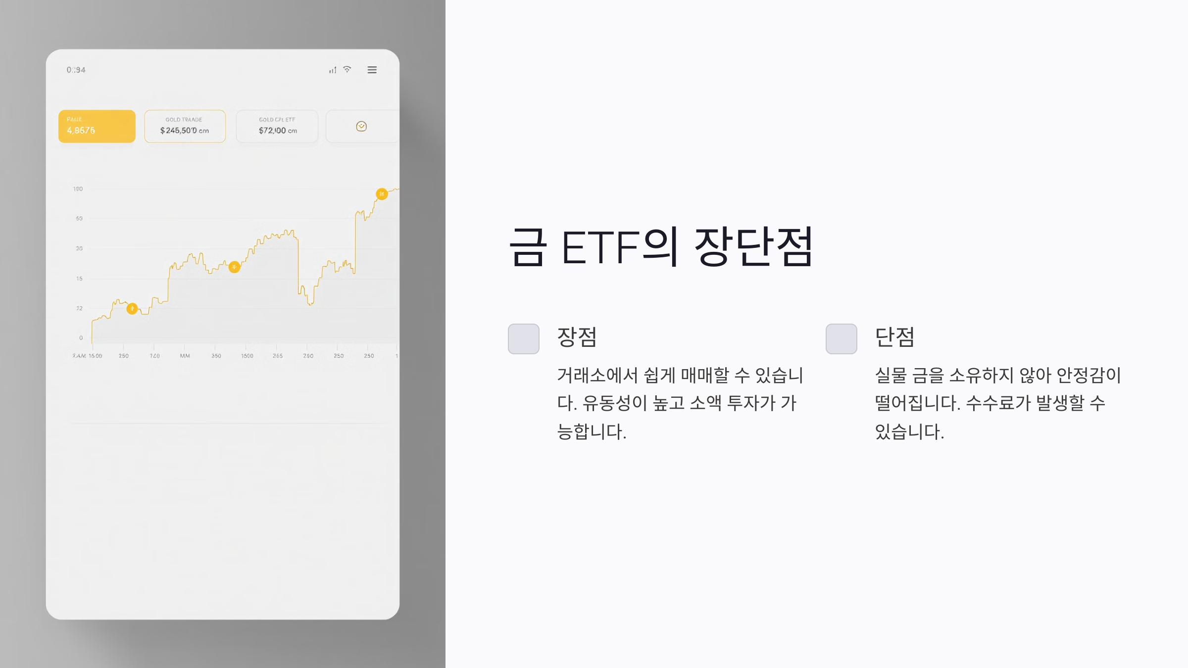 장점: 금 ETF는 주식처럼 거래소에서 쉽게 사고팔 수 있어요. 따라서 유동성이 매우 높고, 실시간으로 시세를 확인하며 매매할 수 있어요. 관리 비용이 거의 들지 않는다는 점도 큰 장점이에요.