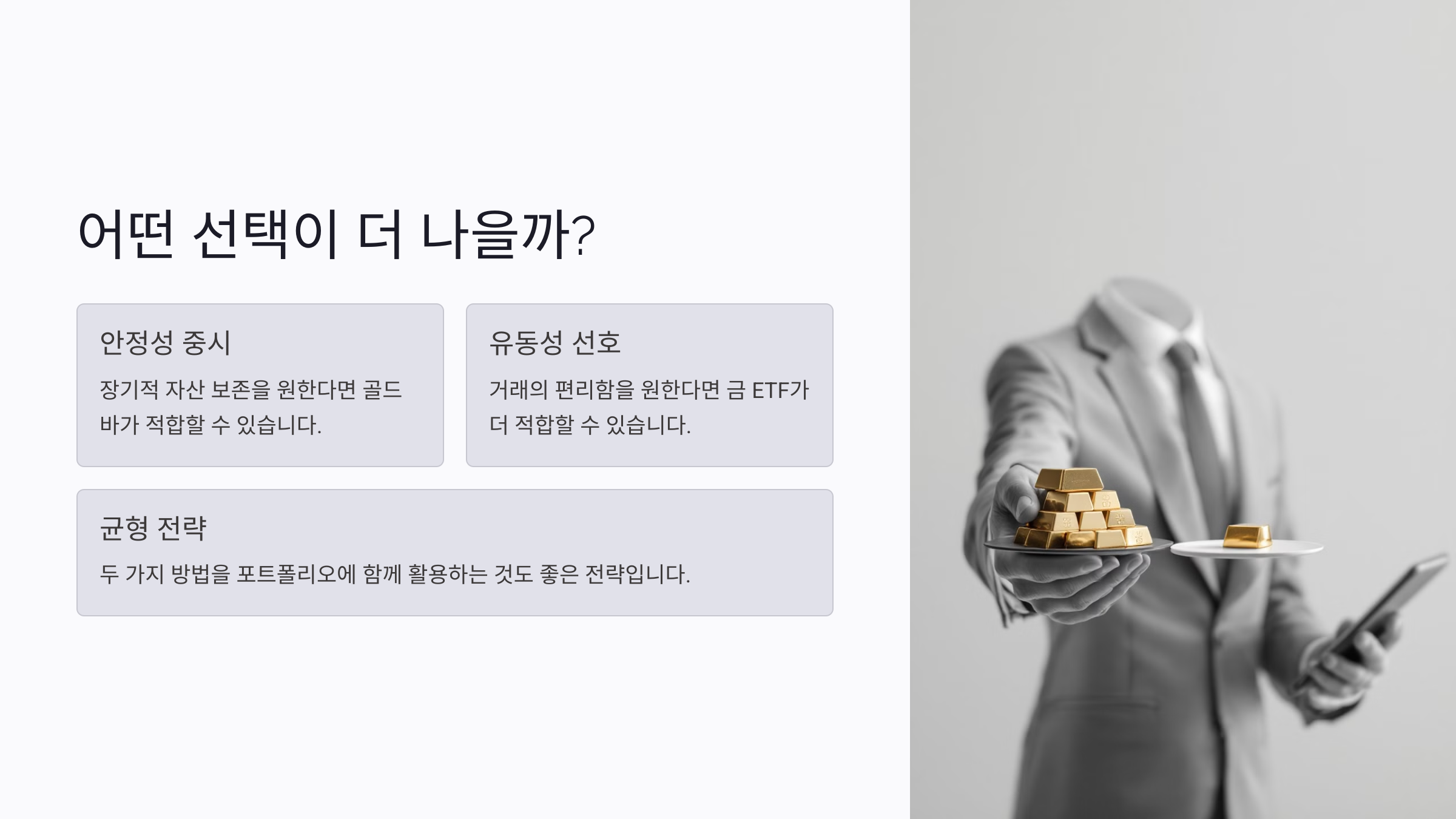 골드바와 금 ETF 중 어떤 것을 선택할지 결정할 때는 투자 목적과 상황을 명확히 하는 것이 중요해요. 자산 보존이 주된 목적이라면 골드바가 더 적합할 수 있고, 유동성과 편리함을 중시한다면 금 ETF를 선택하는 것이 좋아요.