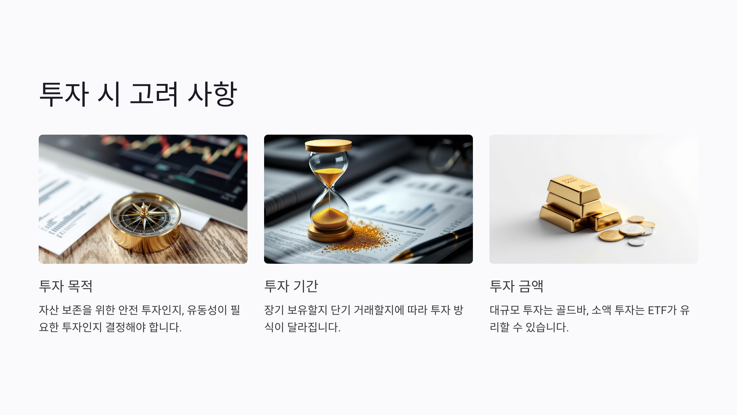 투자 금액도 큰 변수로 작용해요. 소액으로 금에 투자하고 싶다면 금 ETF가 좋은 선택이에요. 하지만 실물 자산을 직접 보유하고 싶은 경우에는 골드바를 선택해야 해요. 두 방법 모두 금값 상승의 이점을 누릴 수 있다는 점에서 공통점을 가지고 있어요.