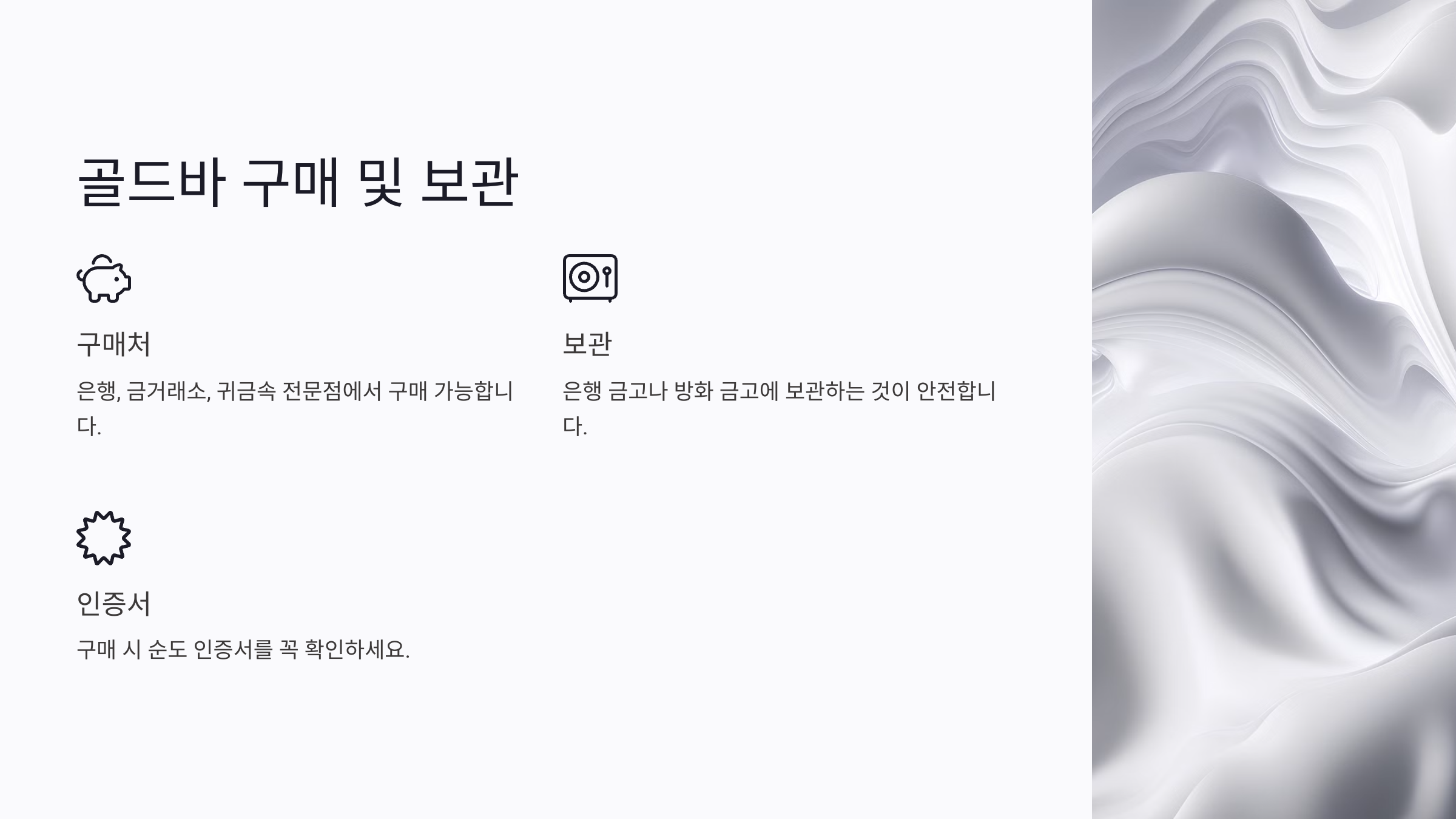 단점: 골드바의 단점은 보관과 관리 비용이에요. 실물 자산이기 때문에 도난, 분실, 화재로부터 보호하려면 별도의 금고나 은행의 금고 서비스를 이용해야 해요. 또한, 구매 시 부가가치세(10%)가 부과된다는 점도 부담으로 작용할 수 있어요.