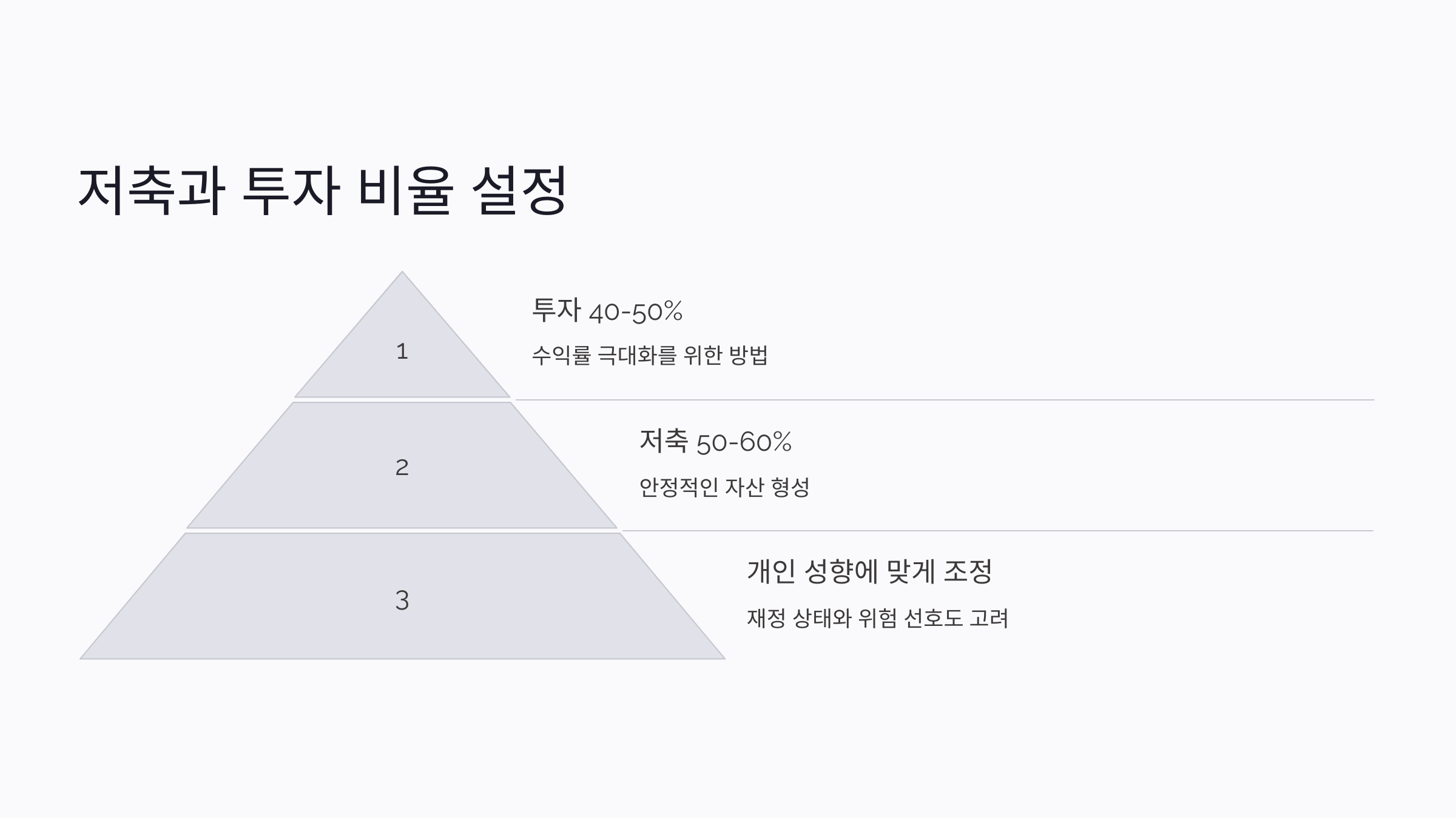 A4. 추천 비율은 저축 50~60%, 투자 40~50%예요. 하지만 본인의 재정 상태와 성향에 맞게 조정하세요.