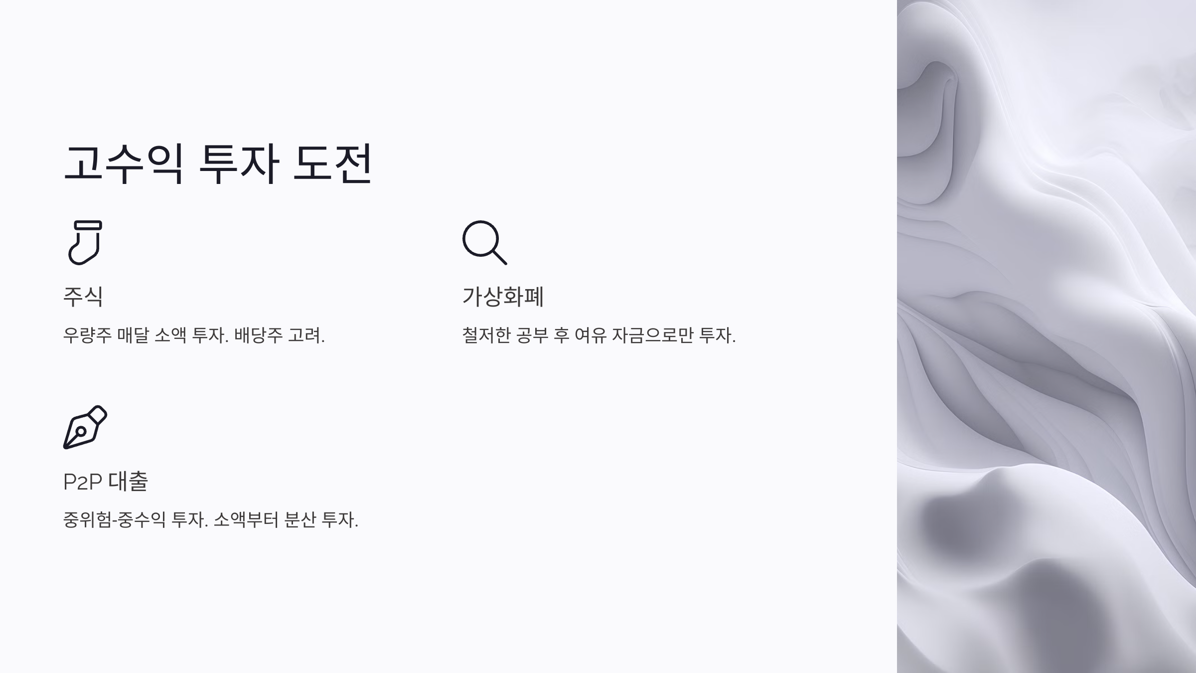 1억을 모으는 속도를 높이려면 고수익 투자에도 도전해볼 필요가 있어요. 물론, 고수익 투자에는 높은 리스크가 따르기 때문에 준비된 상태에서 소액으로 시작하는 것이 중요해요. 대표적인 고수익 투자로는 주식, 가상화폐, 그리고 P2P 대출 플랫폼이 있어요.