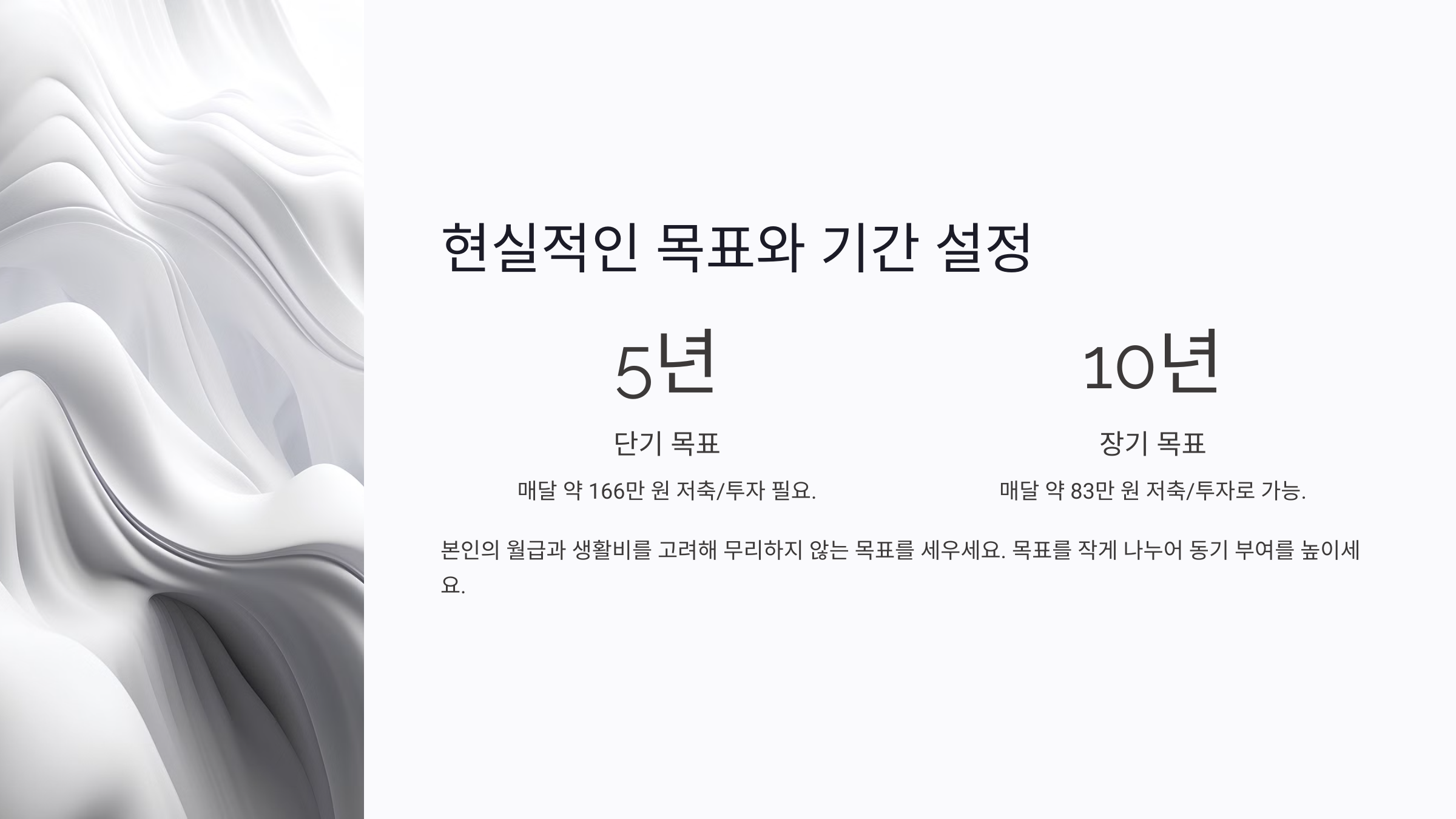 1억 모으기 목표를 달성하기 위해서는 현실적인 기간을 설정하는 것이 중요해요. 예를 들어, 5년 안에 모으려면 매달 약 166만 원씩 저축하거나 투자해야 하고, 10년으로 늘리면 매달 약 83만 원으로도 가능해요. 본인의 월급과 생활비를 고려해 무리하지 않는 목표를 세우는 것이 핵심이에요.