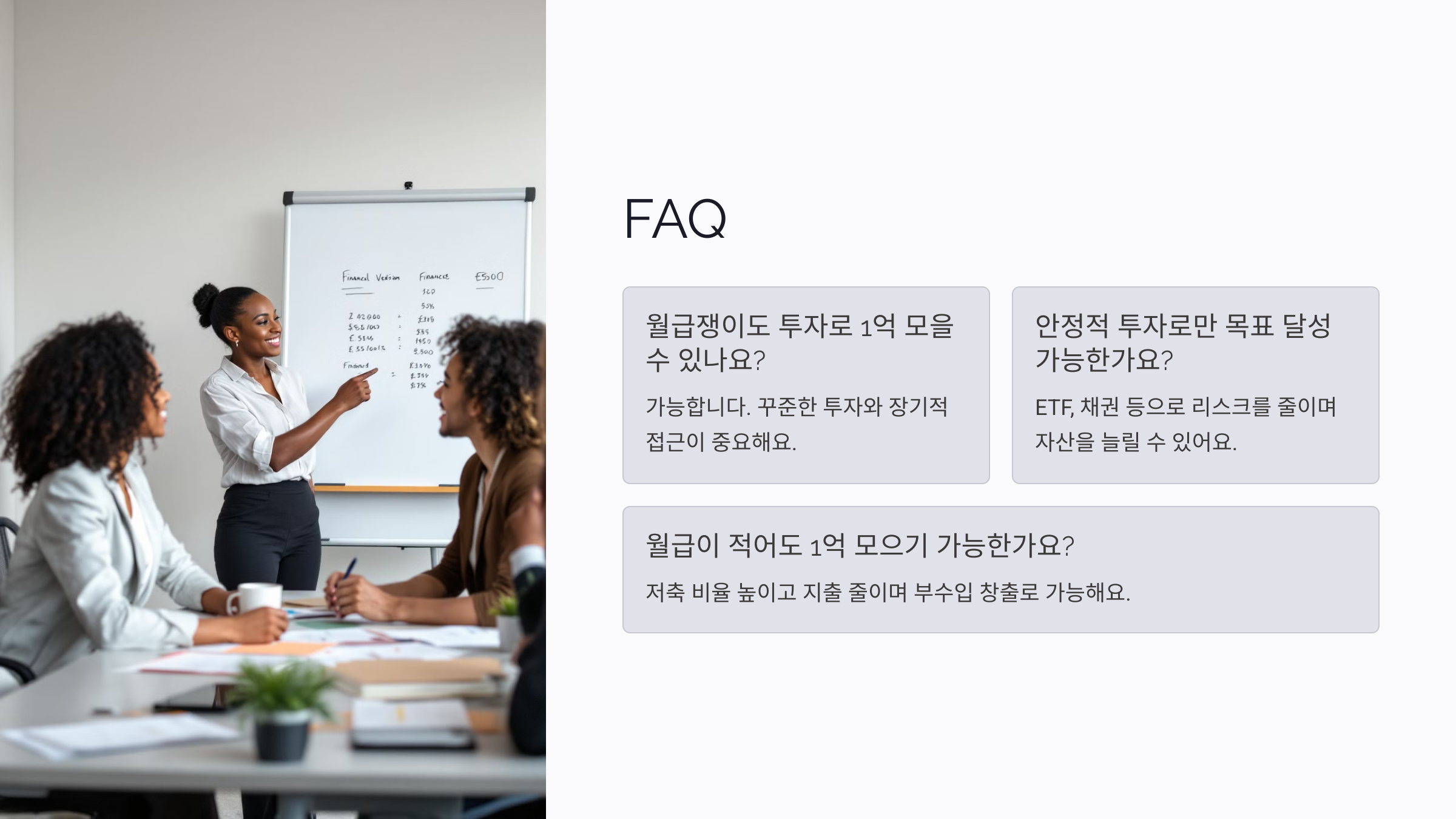 A1. 가능해요! 월급의 일정 비율을 꾸준히 투자하고, 장기적인 관점에서 접근하면 충분히 1억을 모을 수 있답니다.