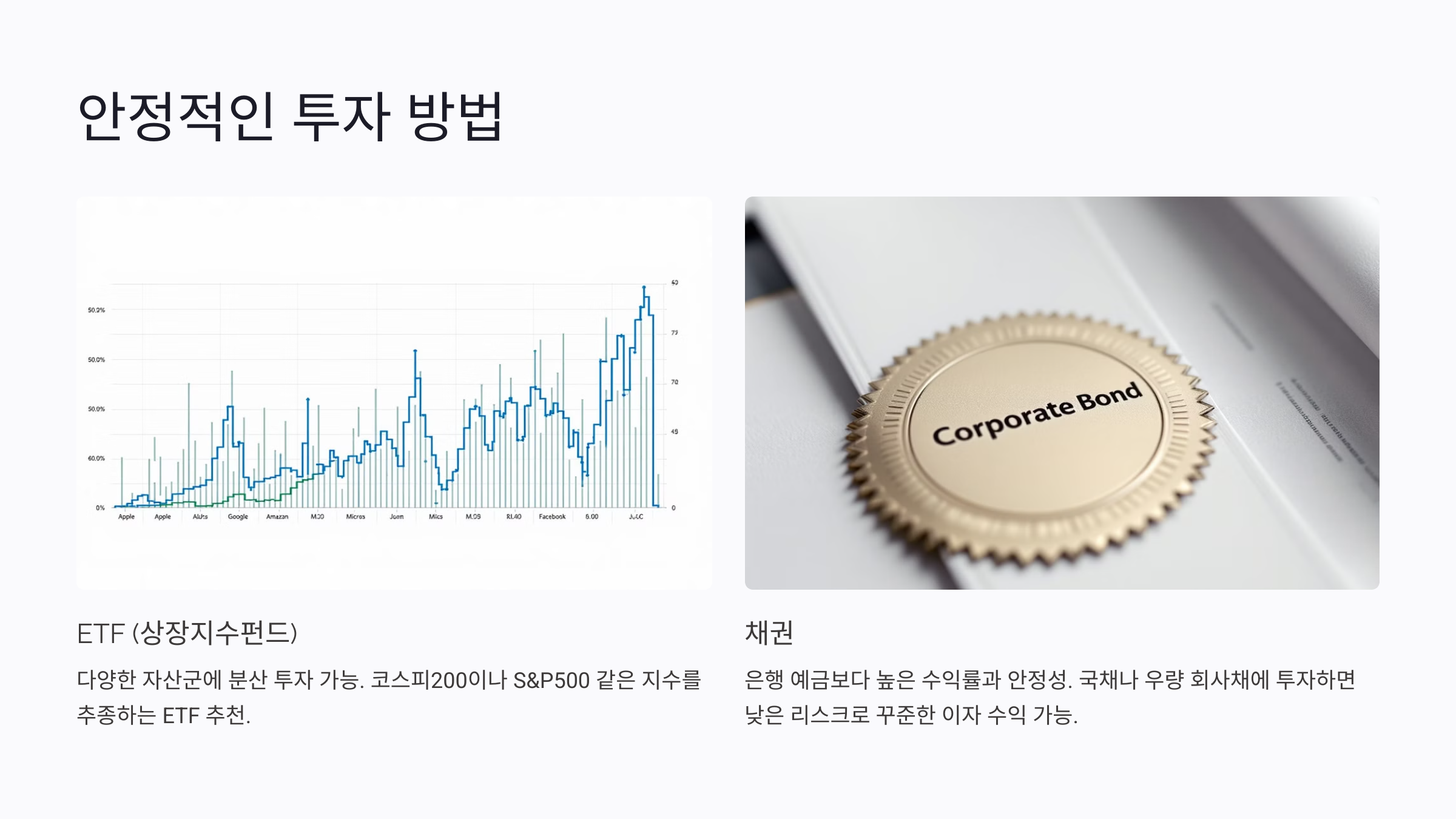 안정적인 투자는 1억을 모으는 과정에서 위험을 줄이고 꾸준히 자산을 늘리는 데 도움을 줘요. 월급쟁이에게 가장 추천하는 방법은 ETF(상장지수펀드)와 채권 투자예요. 이들은 비교적 낮은 위험으로 장기적인 수익을 기대할 수 있답니다.
