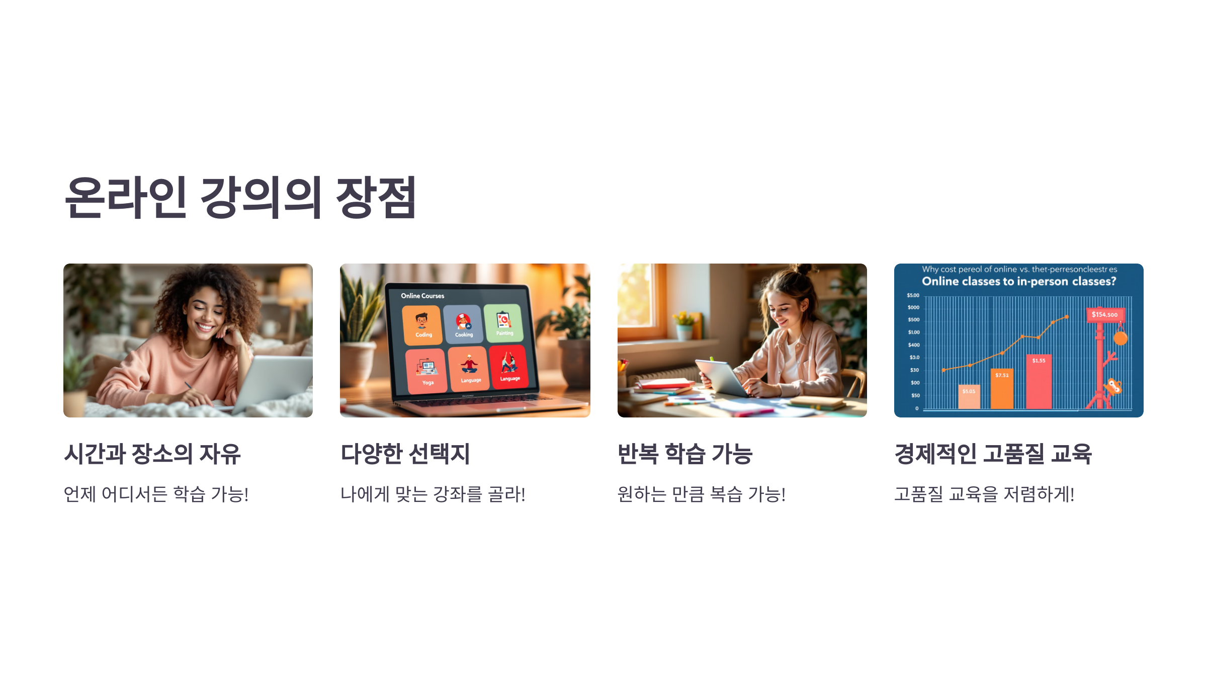 온라인 강의는 시간과 장소의 제약 없이 학습할 수 있는 장점이 있습니다.