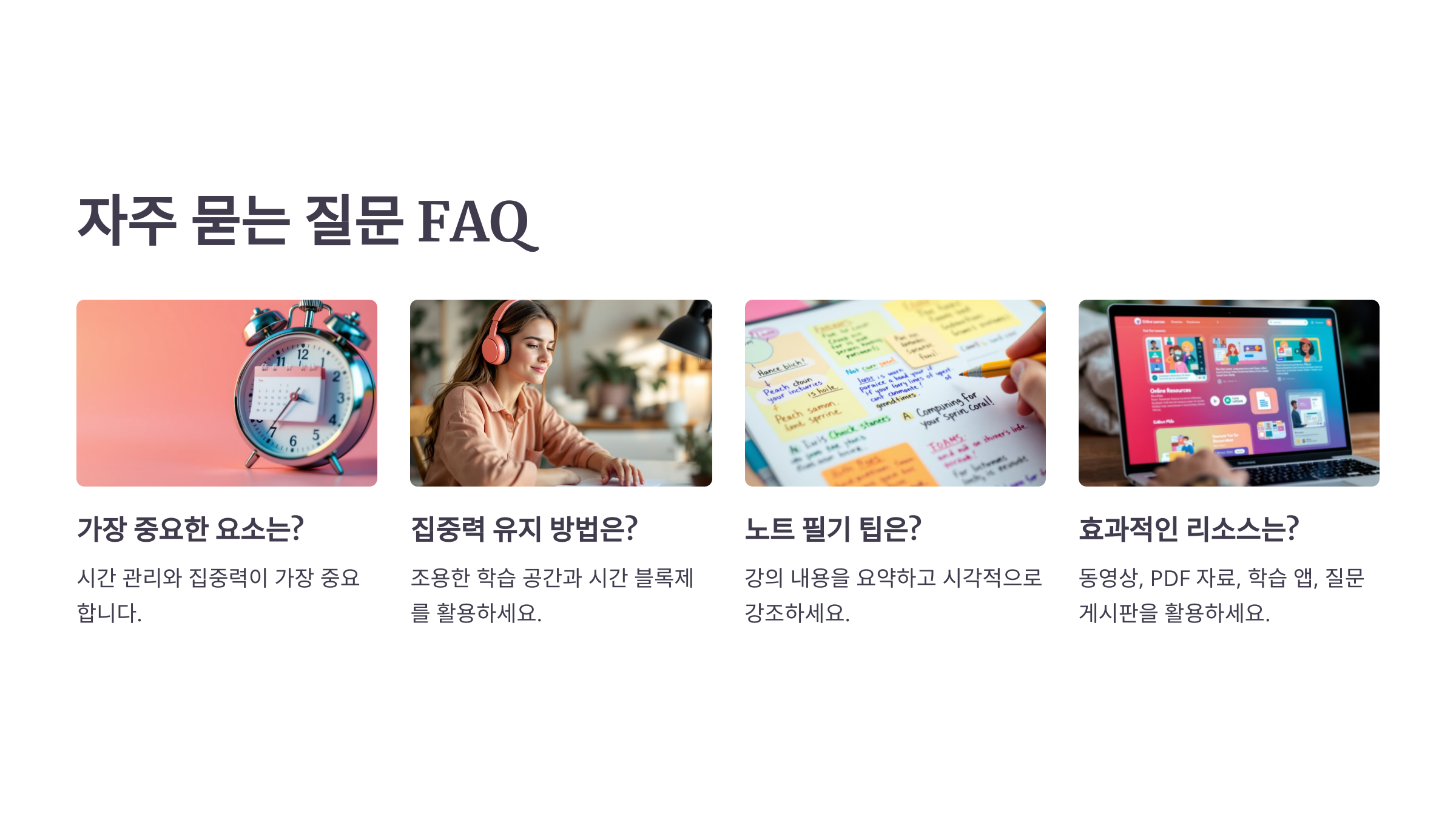 A: 조용한 학습 공간과 시간 블록제를 사용해 집중하세요.