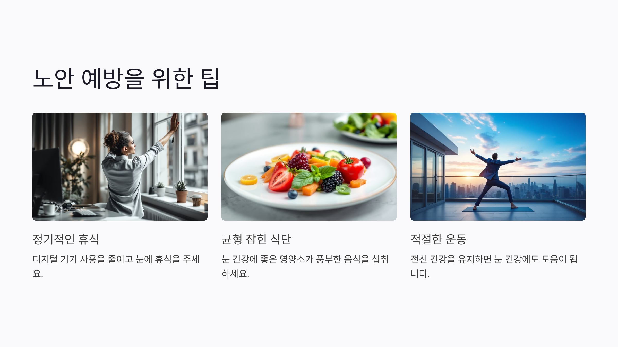 A7. 눈 건강을 위해 정기적으로 휴식을 취하고, 디지털 기기 사용을 줄이는 것이 좋아요. 또한, 균형 잡힌 식단과 적절한 운동도 노안을 예방하는 데 도움이 돼요.
