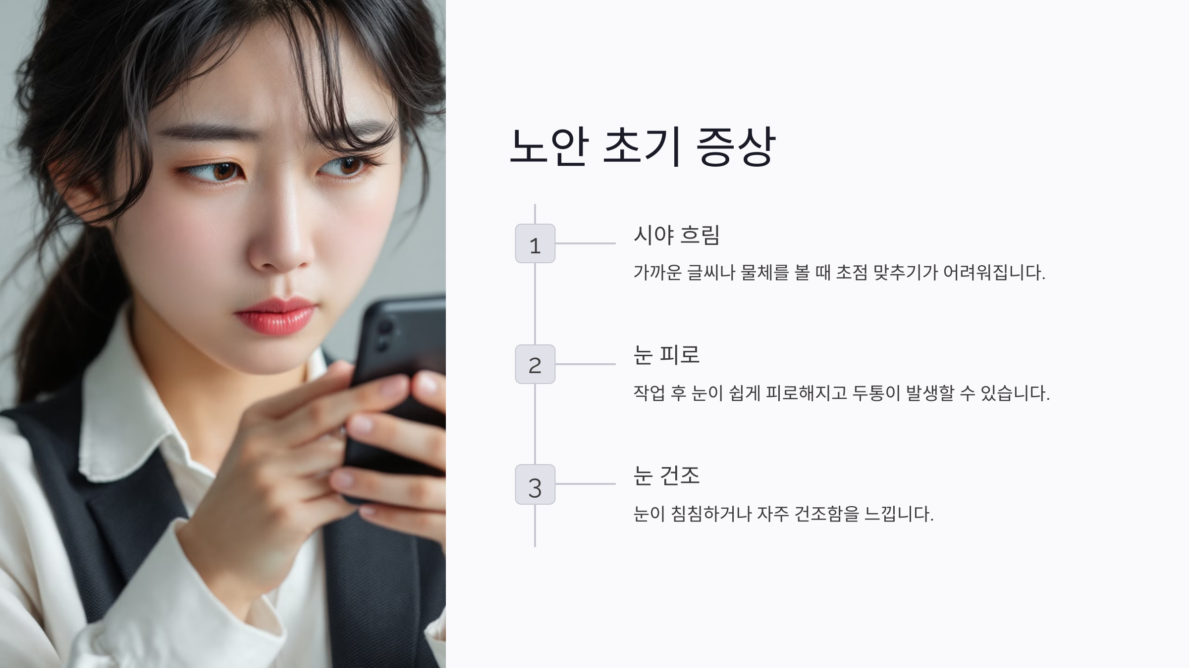 노안 초기에는 눈의 피로나 시야 흐림 같은 미묘한 증상부터 시작돼요. 가장 흔한 초기 신호 중 하나는 가까운 글씨나 물체를 볼 때 초점을 맞추기 어려워지는 거예요. 특히 책, 스마트폰, 메뉴판 같은 작은 글씨를 읽을 때 눈이 쉽게 피로해지는 경우가 많아요.