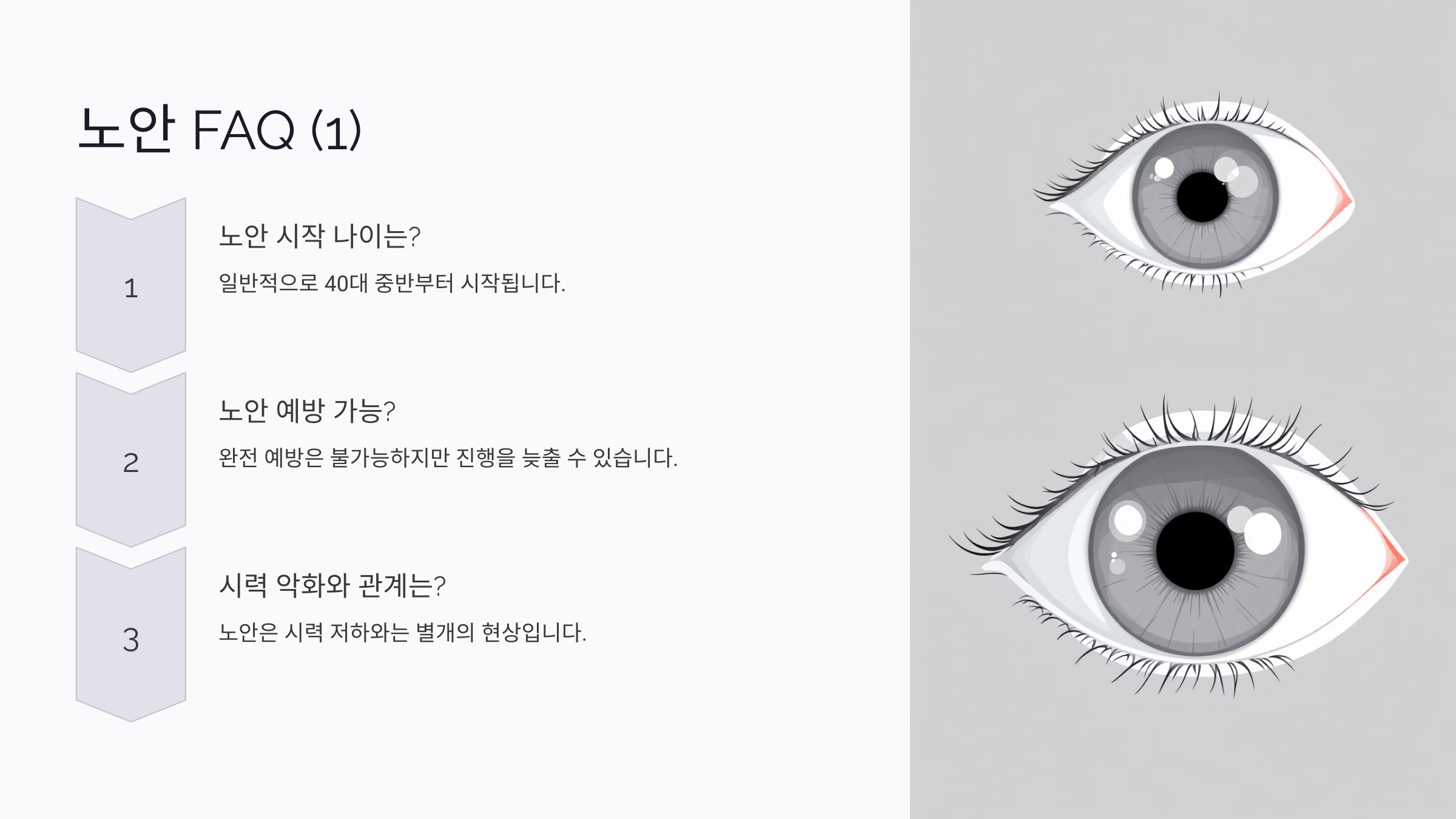A3. 노안은 자연스러운 노화 과정으로, 시력 저하와는 별개의 현상이지만, 조기 관리가 부족하면 일상생활에서 불편함을 느낄 수 있어요.