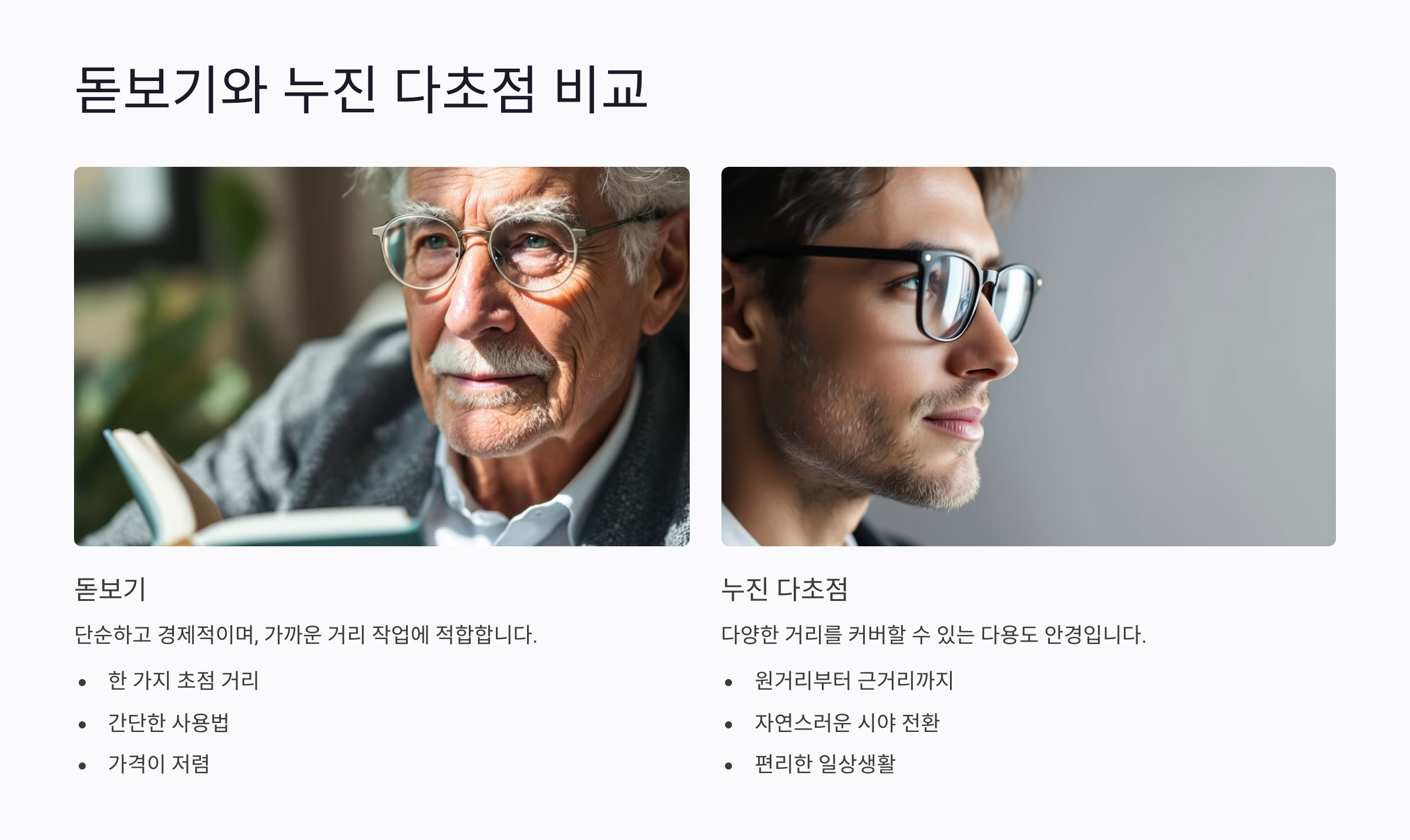 하지만 단순히 가까운 물체만 선명하게 보이게 하는 돋보기 안경과, 다양한 거리에서도 초점을 맞출 수 있는 누진 다초점 안경은 기능적인 차이가 커요. 따라서 자신의 라이프스타일과 필요에 맞는 안경을 선택하는 것이 중요하답니다.