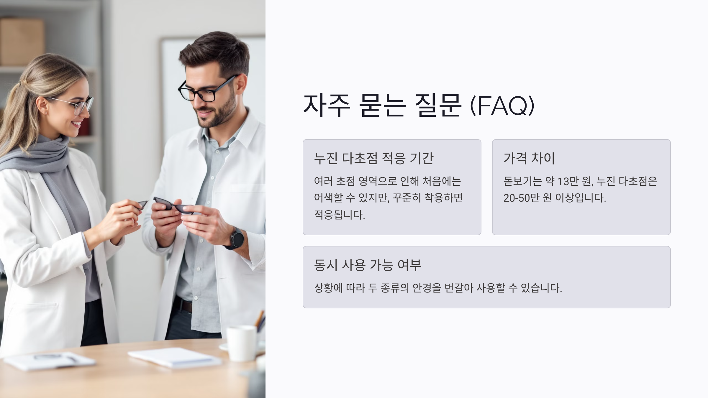 A7. 보통 40대 후반에서 50대 초반의 사람들이 두 안경을 동시에 사용하는 경우가 많아요. 초기에는 돋보기를 사용하다가, 점차 누진 다초점으로 전환하는 경우가 많답니다.