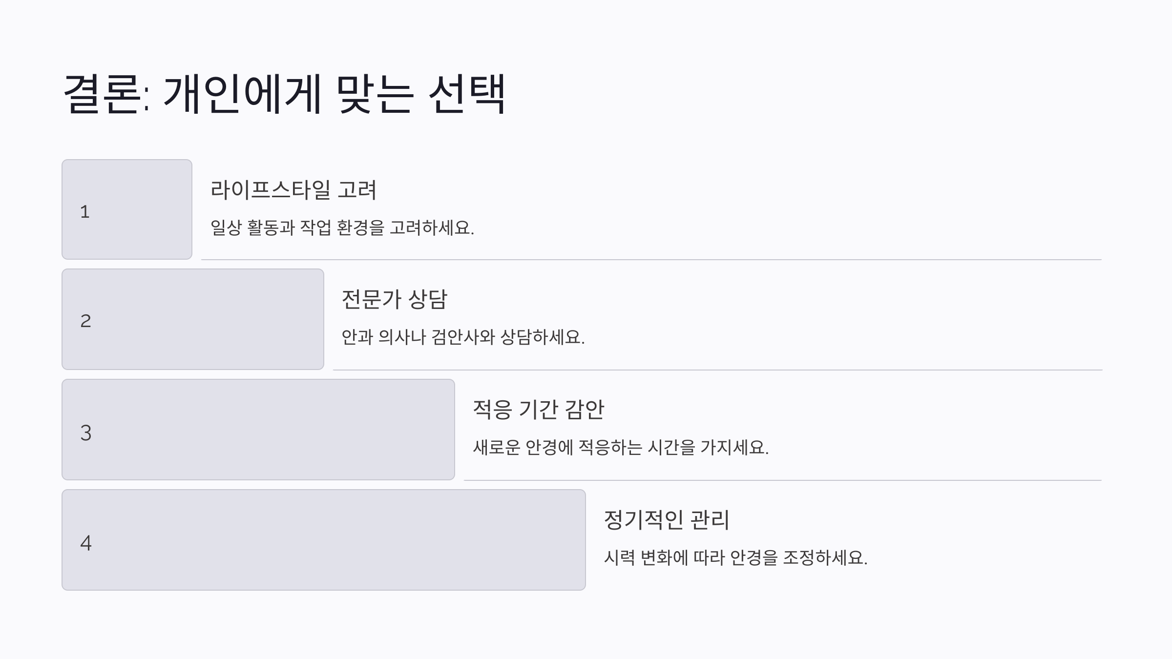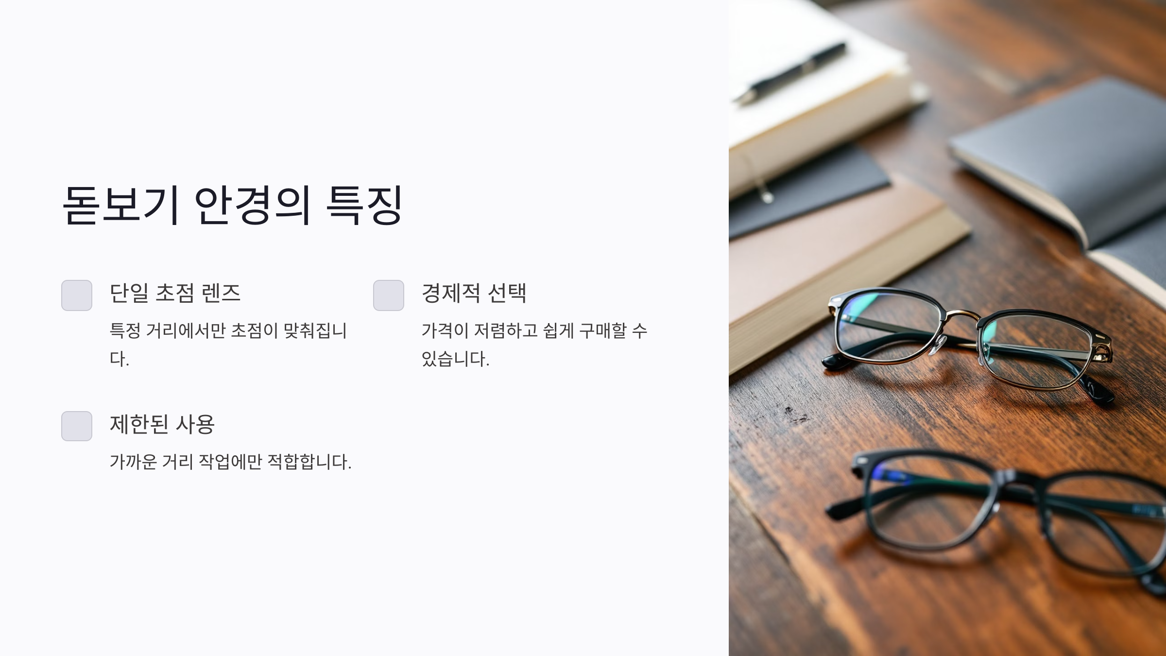 4. 초기 노안 증상: 아직 증상이 심하지 않다면 저렴한 돋보기를 시작으로, 이후 증상에 따라 누진 다초점 안경으로 바꾸는 것도 좋은 방법이에요.