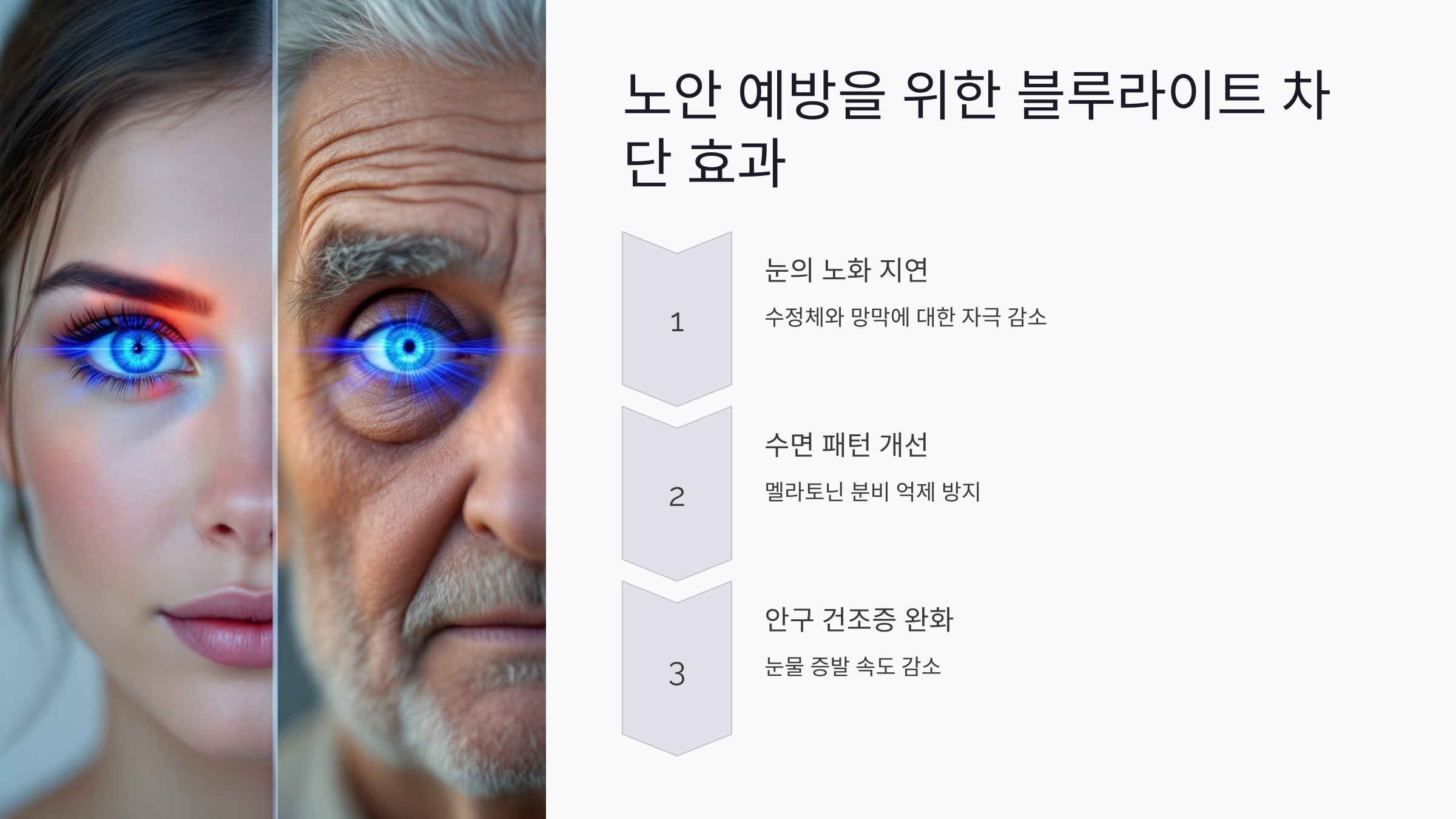 최근 연구에 따르면, 블루라이트는 장기적으로 눈의 노화를 촉진하고, 노안의 진행을 앞당길 수 있다는 점에서 더 큰 주목을 받고 있어요. 따라서 이 빛을 차단하거나 줄이는 것이 눈 건강 관리에서 매우 중요한 요소로 떠오르고 있답니다.