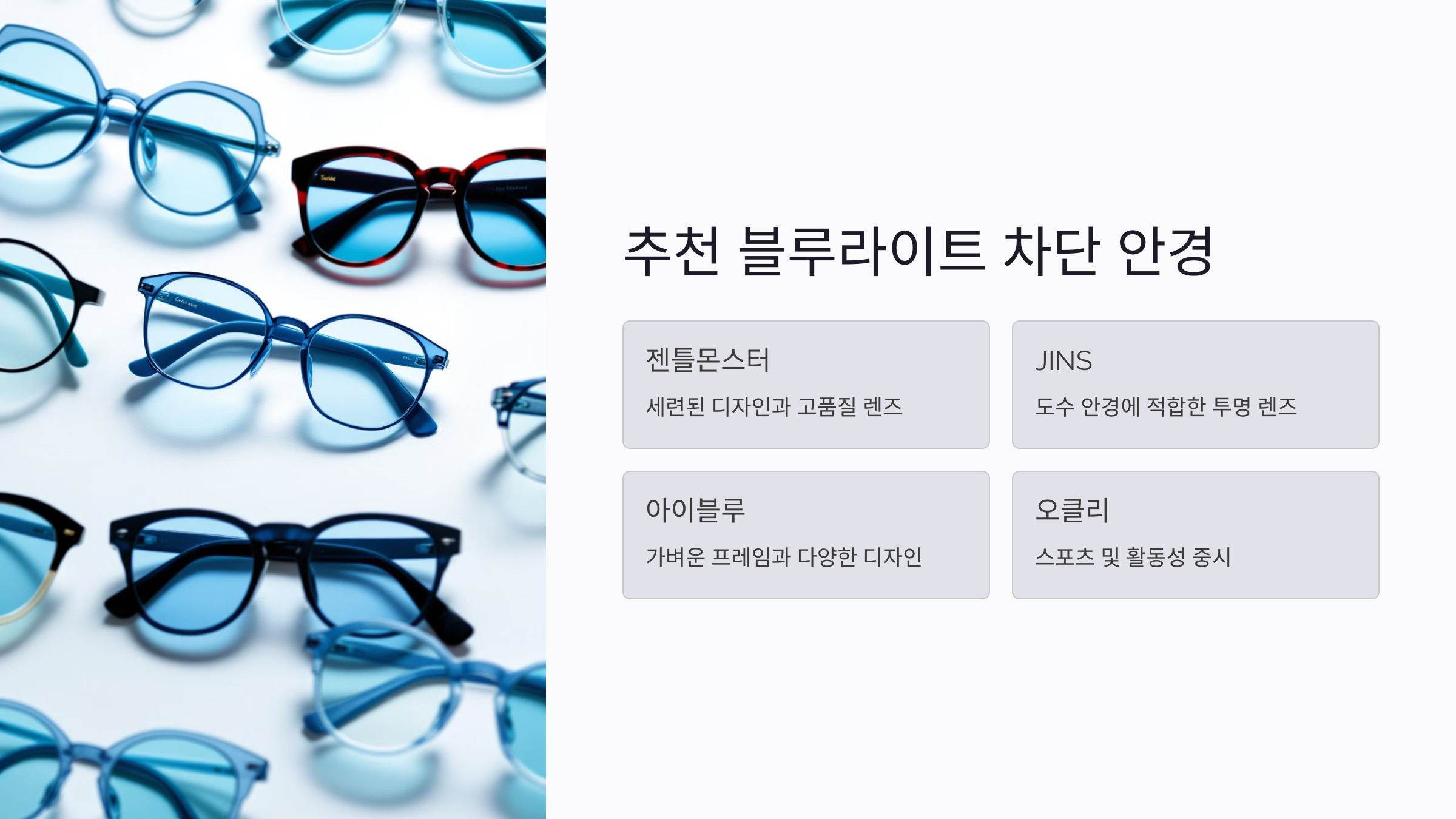 블루라이트 차단 안경을 선택할 때는 자신의 생활 패턴과 눈 건강 상태를 고려해야 해요. 아래는 국내에서 인기 있는 블루라이트 차단 안경 브랜드와 제품 추천이에요.