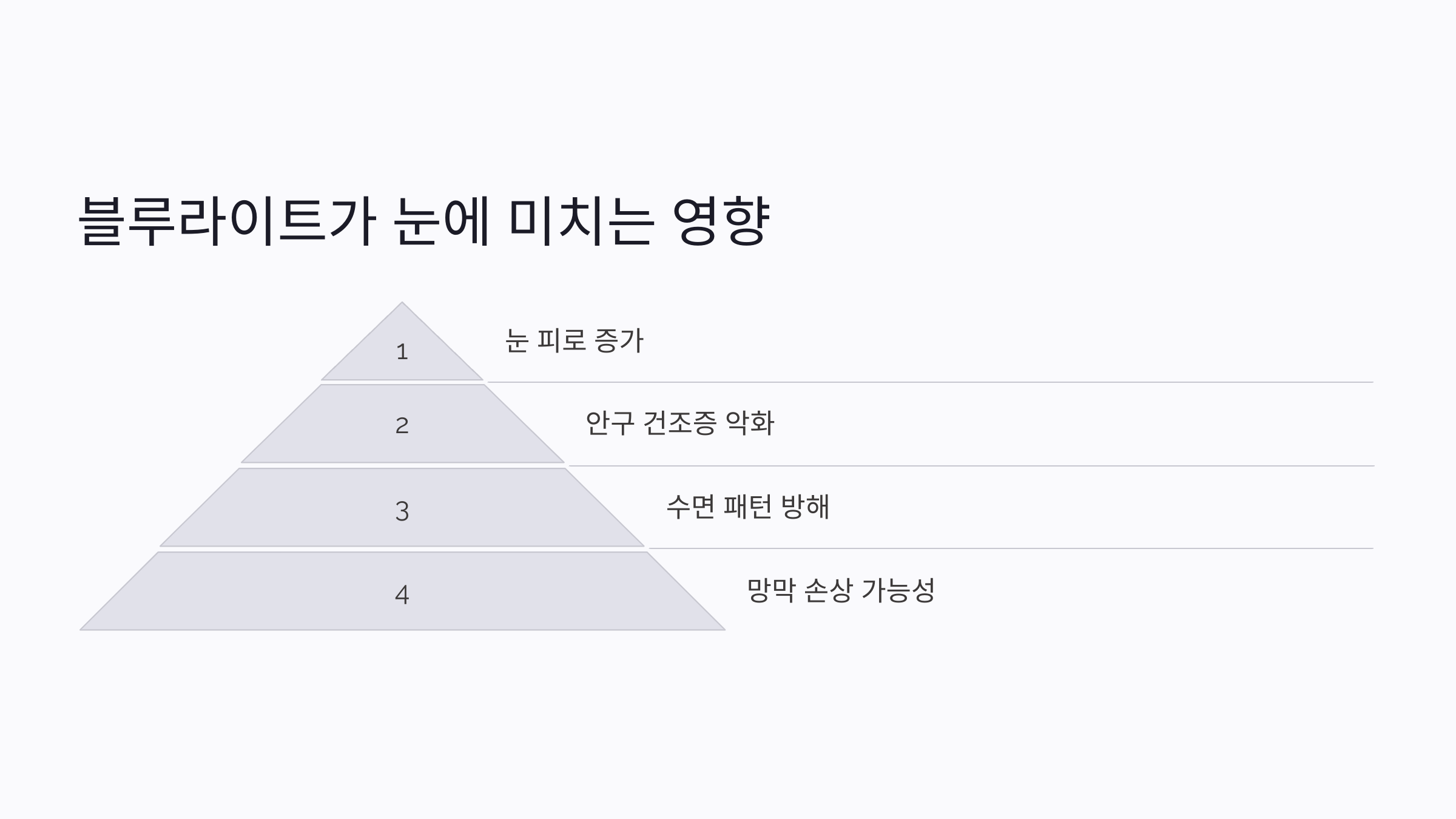 블루라이트는 눈 건강에 여러 부정적인 영향을 미칠 수 있어요. 가장 흔한 영향은 눈의 피로 증가예요. 장시간 디지털 화면을 바라보면 눈이 쉽게 피로해지고, 초점을 맞추는 데 어려움을 겪을 수 있답니다. 이런 증상은 '디지털 눈 피로(Digital Eye Strain)'라고도 불려요.
