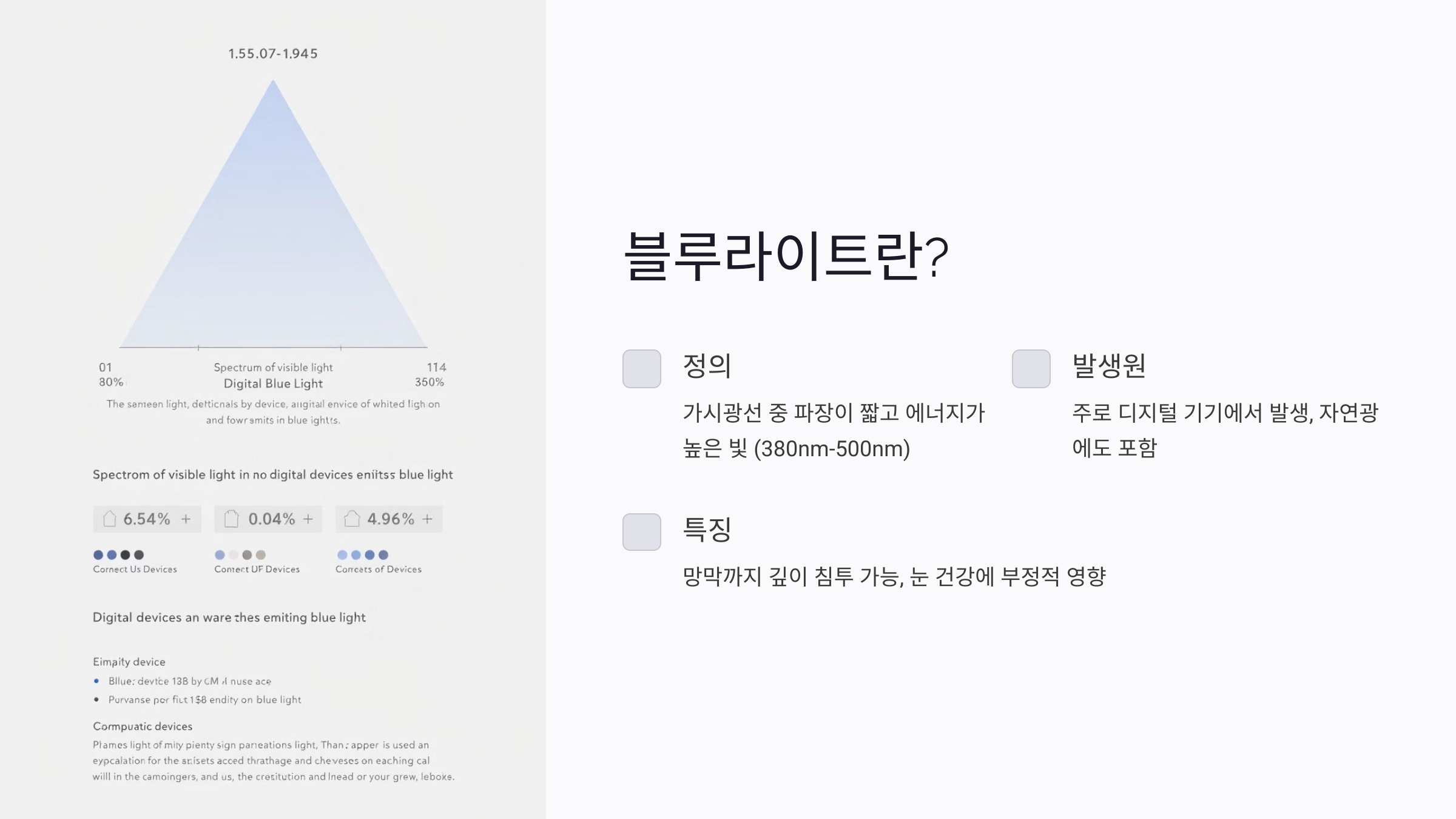블루라이트는 가시광선 중에서도 파장이 짧고 에너지가 높은 빛으로, 주로 디지털 기기에서 발생해요. 380nm에서 500nm 사이의 빛으로 분류되며, 청색광이라고도 불려요. 자연광에서도 블루라이트는 포함되어 있지만, 디지털 기기에서 나오는 블루라이트는 눈 건강에 부정적인 영향을 미칠 가능성이 더 높아요.