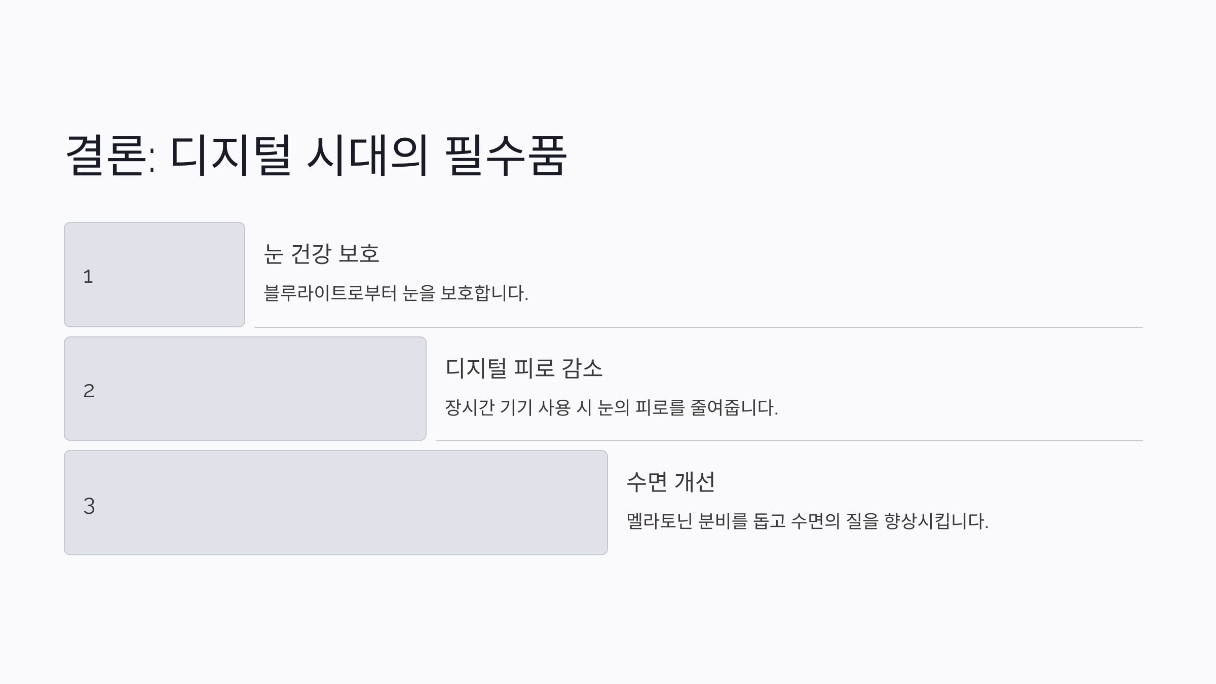 더 나아가 블루라이트는 수면 패턴에도 영향을 미쳐요. 블루라이트는 멜라토닌이라는 수면 호르몬의 분비를 억제하여 수면의 질을 저하시킬 수 있어요. 늦은 저녁 시간에 스마트폰이나 컴퓨터를 사용할 경우, 잠들기 어려워지거나 깊은 수면을 방해받을 수 있답니다.
