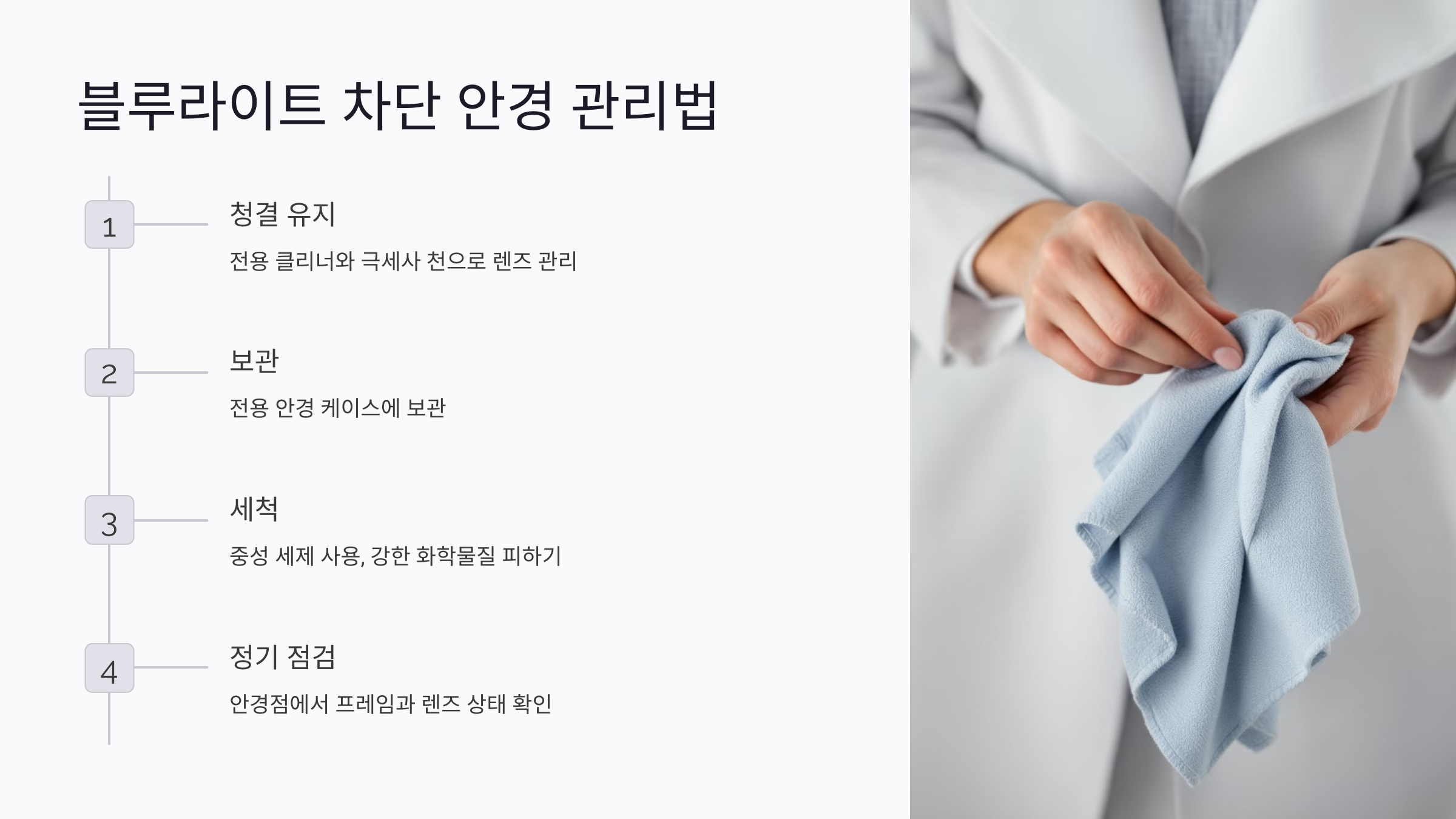 블루라이트 차단 안경을 오래 사용하려면 올바른 관리가 필요해요. 첫 번째로, 렌즈를 항상 깨끗하게 유지하는 것이 중요해요. 전용 클리너와 극세사 천을 사용해 먼지와 지문을 제거해 주세요. 일반 천이나 손으로 닦으면 렌즈 표면에 흠집이 생길 수 있어요.