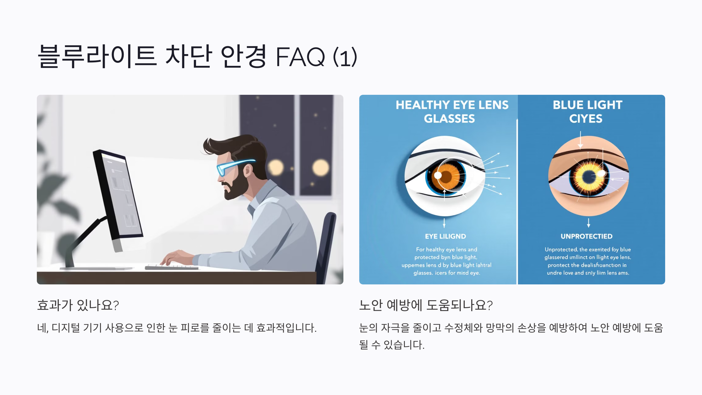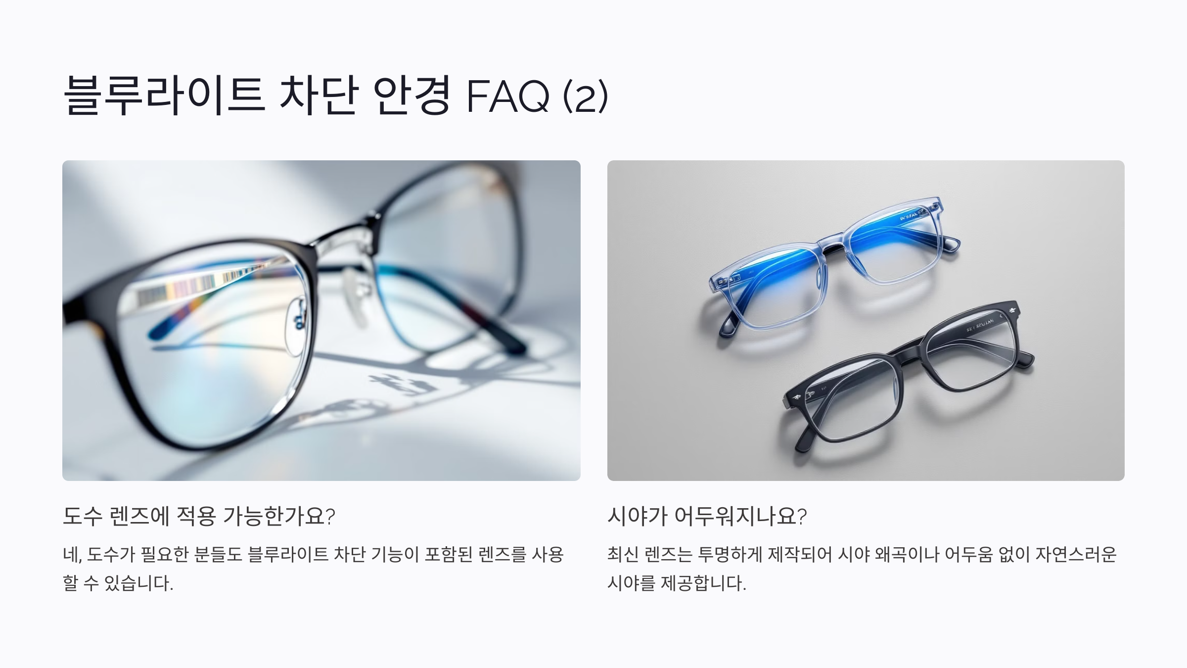 A4. 물론이에요! 도수가 필요한 분들도 블루라이트 차단 기능이 포함된 렌즈를 사용할 수 있어요. 안경점에서 개인 맞춤 제작이 가능해요.