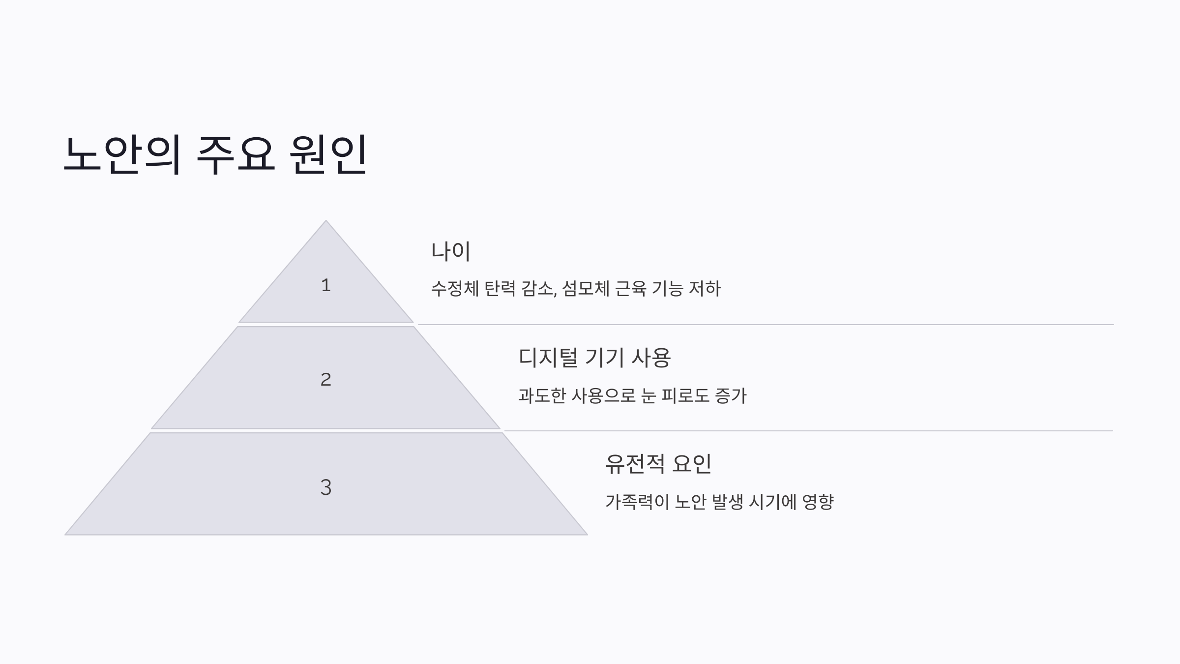 유전적인 요인도 노안 발생 시기에 영향을 미칠 수 있어요. 가족 중 노안을 일찍 겪은 사람이 있다면, 본인도 비슷한 시기에 노안 증상을 느낄 가능성이 높아요. 이러한 다양한 요인들이 복합적으로 작용해 노안이 발생하게 돼요.
