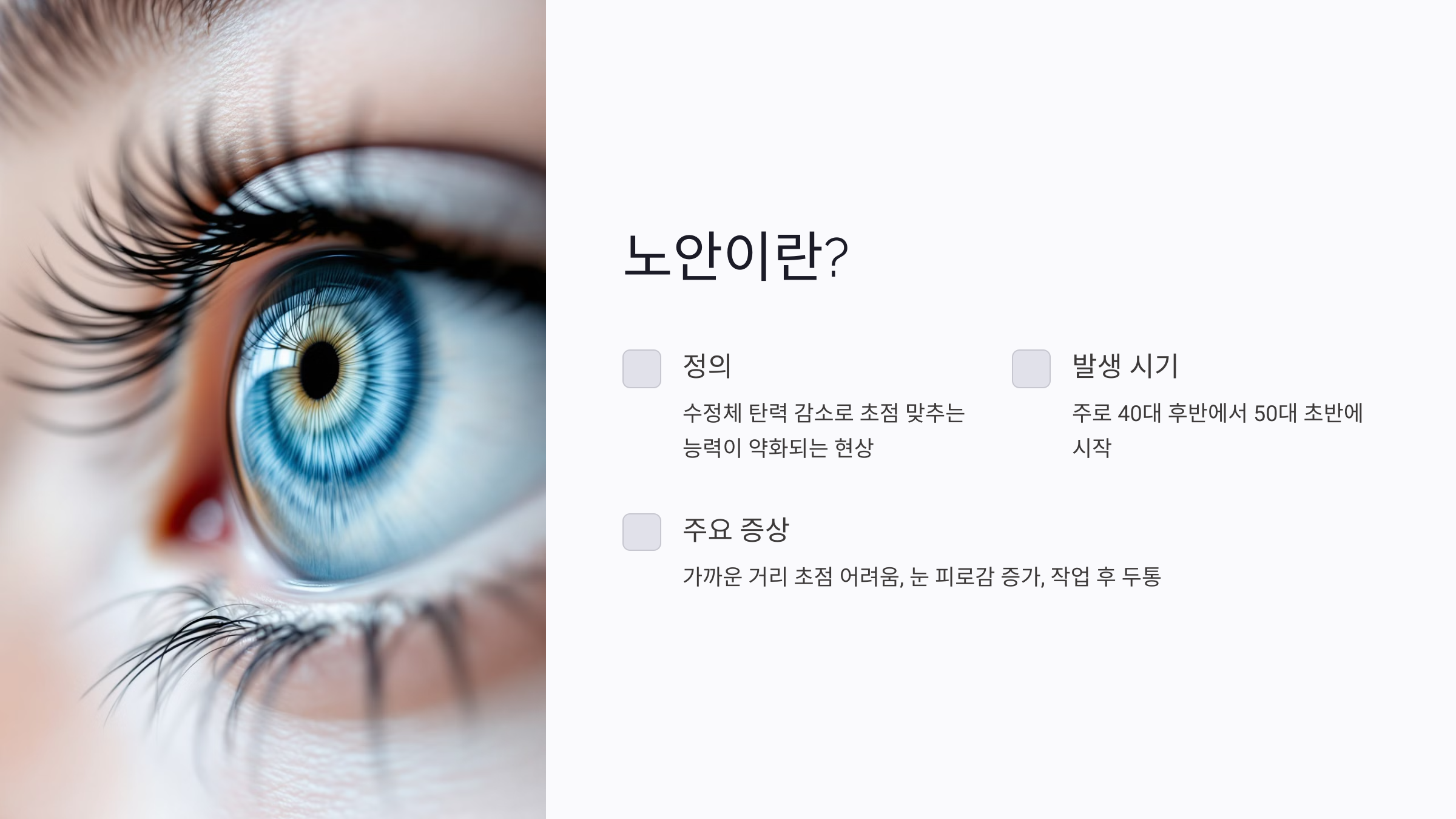 노안은 수정체의 탄력이 감소하면서 초점을 맞추는 능력이 약화되는 현상이에요. 특히 40대 후반에서 50대 초반에 주로 시작되며, 가까운 거리에서 글씨를 읽기 어렵거나, 작은 물체가 흐릿하게 보이는 증상이 나타나죠.