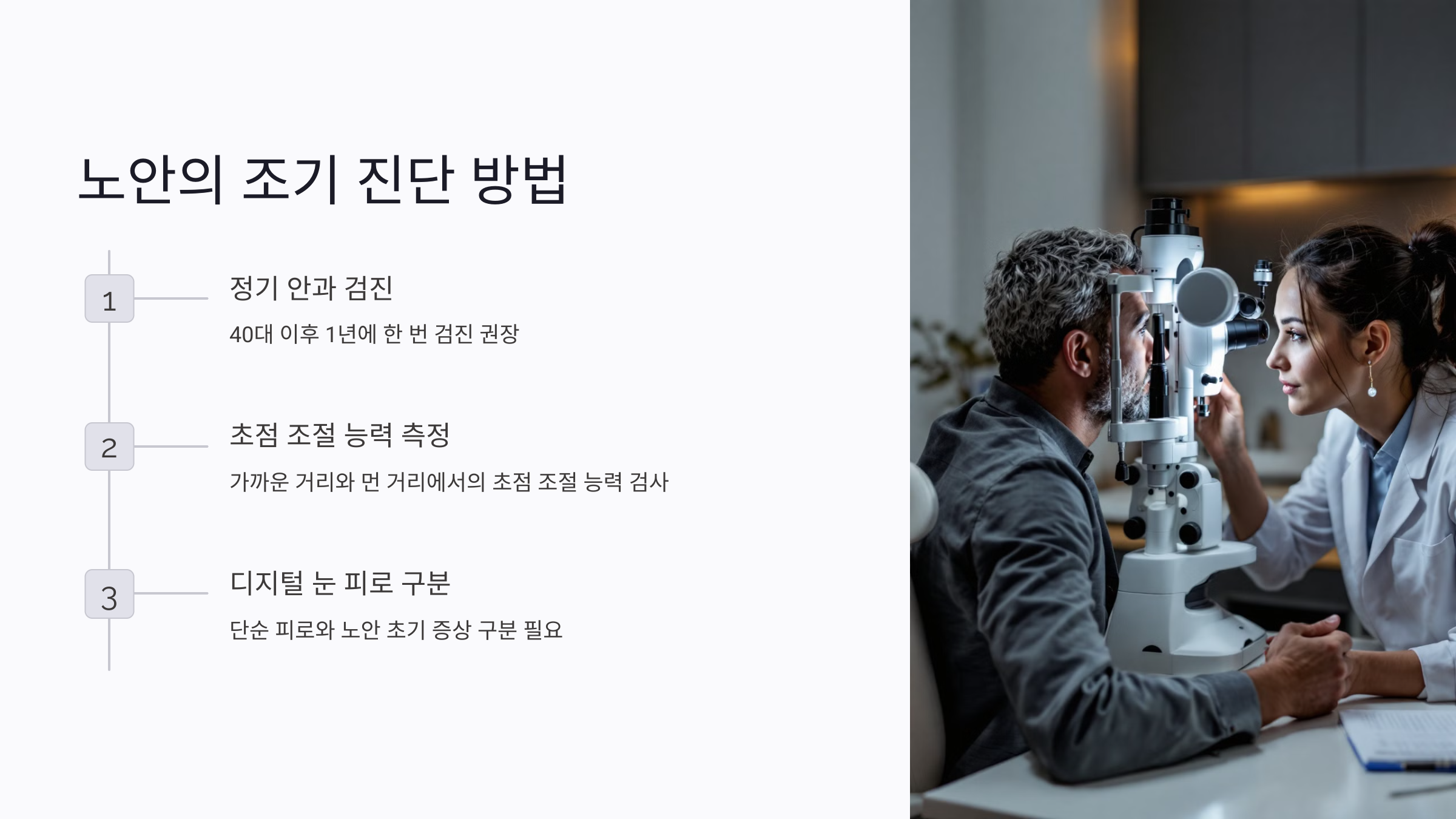 노안을 조기에 진단하기 위해서는 정기적인 안과 검진이 중요해요. 특히 40대 이후에는 시력 변화가 급격히 나타날 수 있으니, 1년에 한 번 정도는 검진을 받는 것을 추천해요. 안과 검진에서는 수정체의 상태와 눈의 조절 능력을 종합적으로 확인할 수 있답니다.