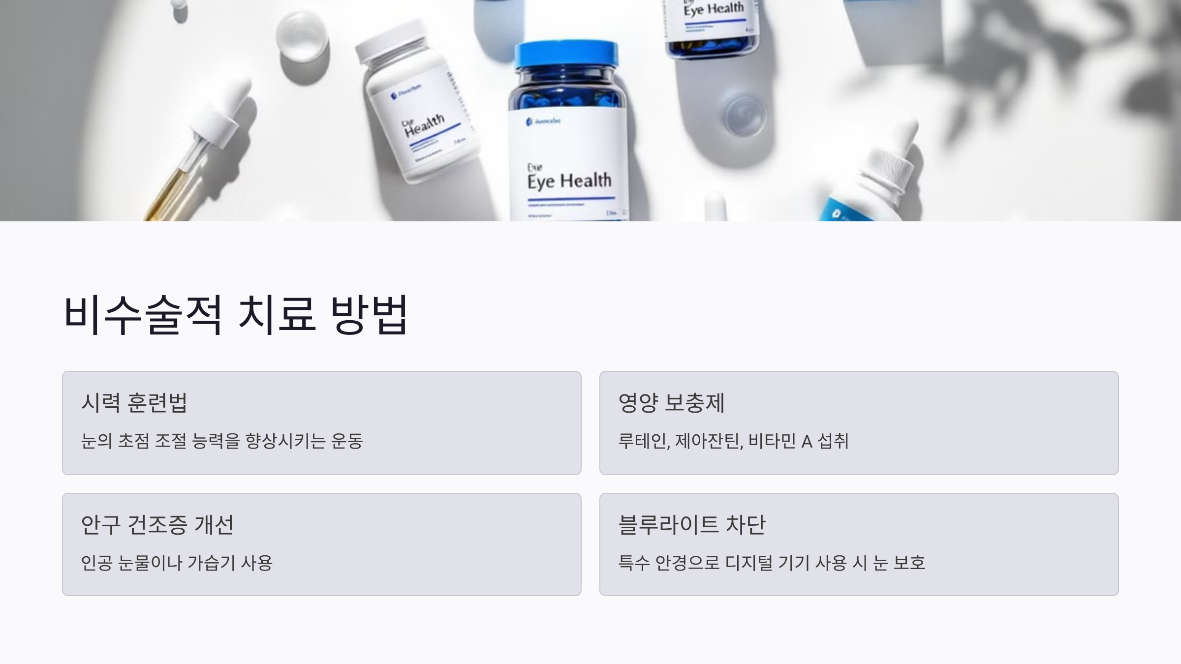 수술이나 렌즈 외에도 비수술적 방법으로 노안을 관리할 수 있는 다양한 선택지가 있어요. 먼저, 시력 훈련법이에요. 시력 훈련은 눈의 초점 조절 능력을 향상시키기 위해 특별히 고안된 운동이에요. 예를 들어, 먼 곳과 가까운 곳을 번갈아 가며 초점을 맞추는 연습을 통해 눈 근육의 유연성을 키울 수 있답니다.