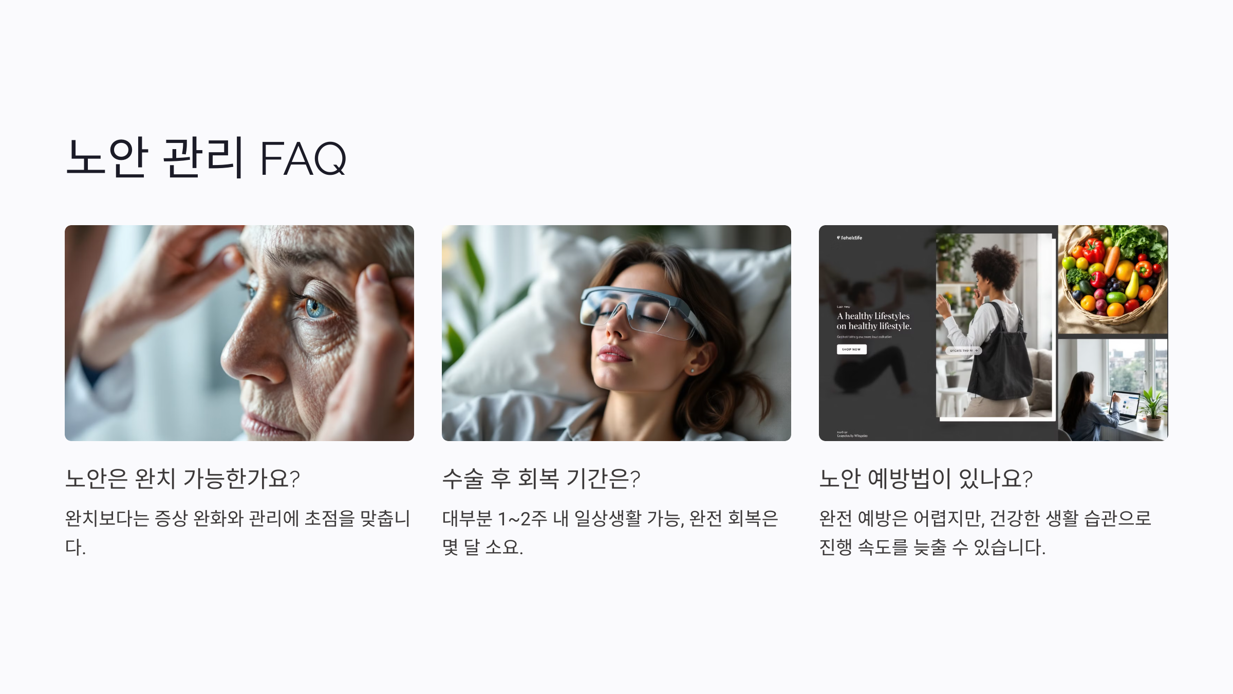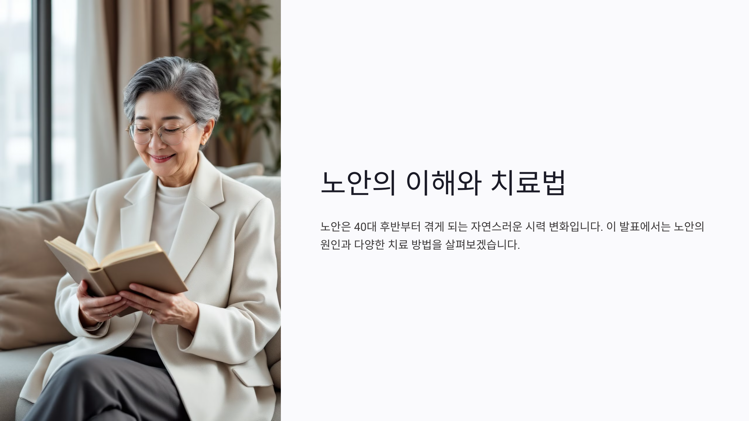 ※ 본 글은 노안 치료에 대한 일반적인 정보를 제공하기 위한 것이며, 특정 수술 방법이나 의료기기, 보험상품의 권유 또는 판매를 목적으로 하지 않습니다. 치료 방식은 개인의 상태에 따라 다를 수 있으므로, 반드시 전문가와 상담 후 결정하시기 바랍니다.