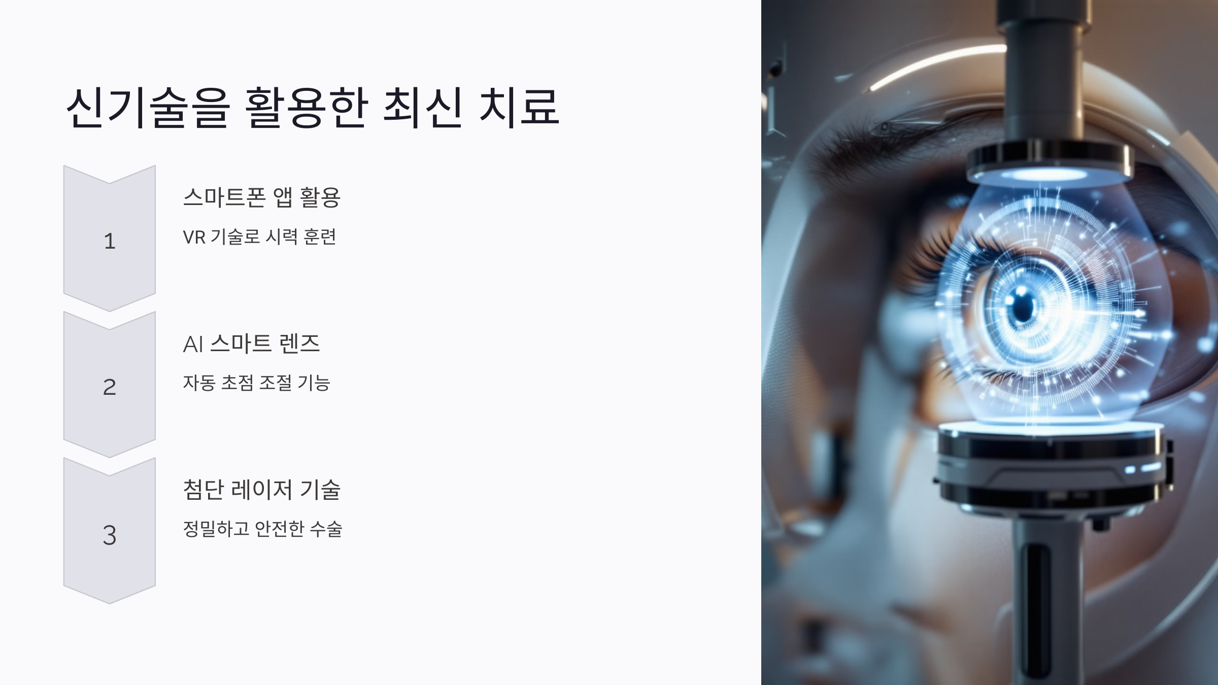 최근 노안 치료 분야에서는 첨단 기술이 빠르게 도입되고 있어요. 예를 들어, 스마트폰 앱이나 VR(가상현실)을 활용한 시력 훈련 프로그램이 개발되고 있어요. 이러한 프로그램은 노안 증상을 완화하고 눈 근육의 유연성을 높이는 데 도움을 줄 수 있어요.