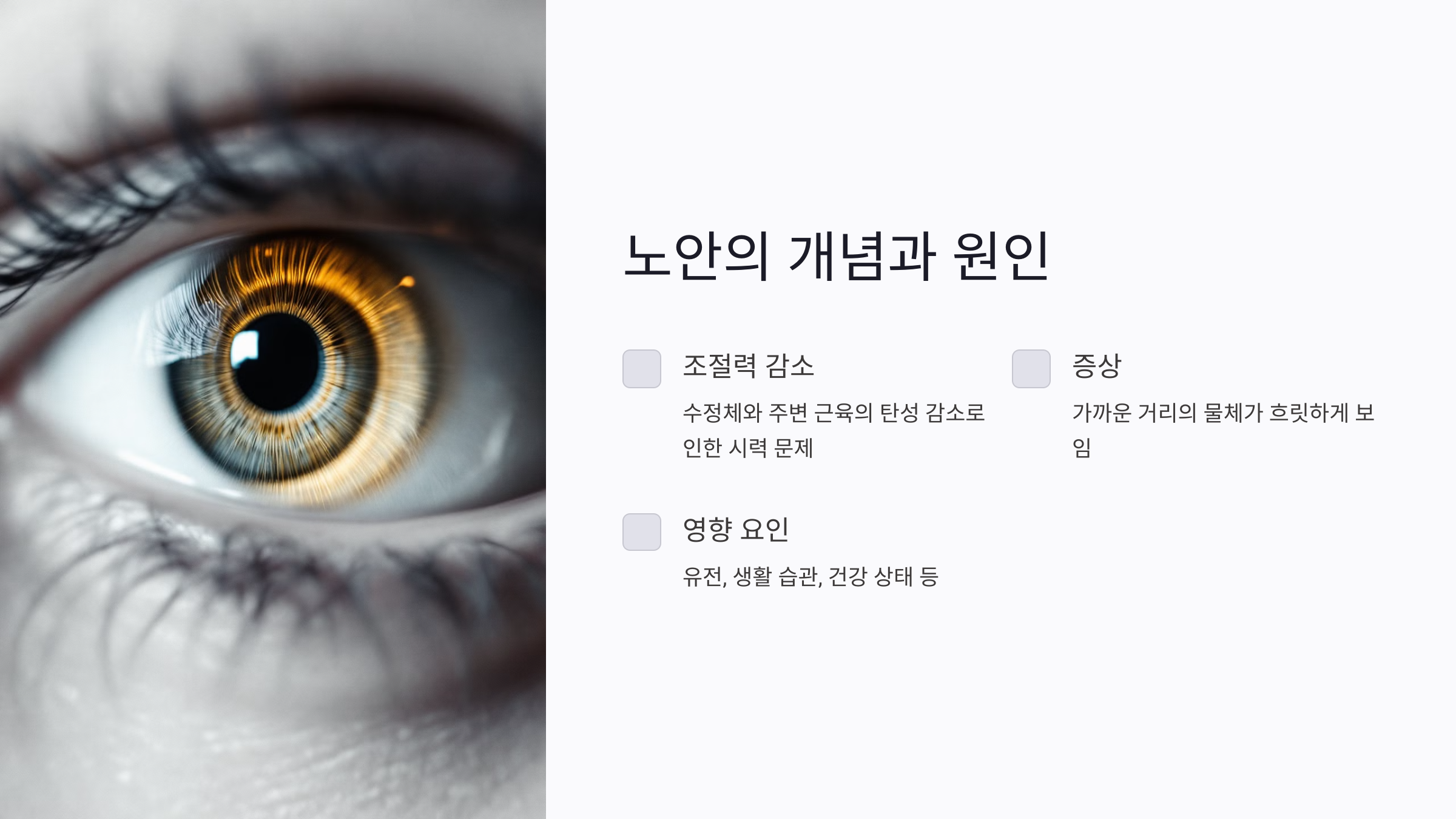 노안은 의학적으로는 ‘조절력 감소’라고 불리며, 이는 수정체와 주변 근육의 탄성이 줄어들어 발생하는 시력 문제를 뜻해요. 나이가 들면서 수정체가 딱딱해지고, 조절 근육이 약해져 초점을 조절하기 어려워지는 것이죠. 이로 인해 가까운 거리에 있는 글씨나 물체가 흐릿하게 보이게 돼요.