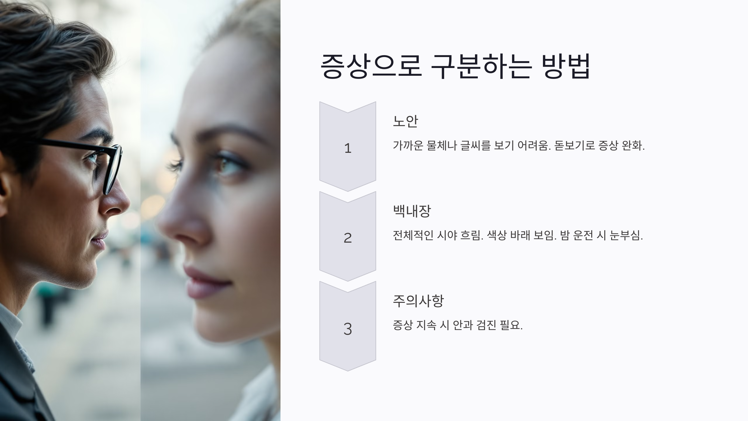 노안은 눈을 쉬게 하거나 돋보기를 착용하면 쉽게 증상이 완화될 수 있지만, 백내장은 조명이 밝아도 시야가 흐려지는 특징을 보여요. 특히 밤에 운전할 때 눈부심이 심하거나 어두운 환경에서 사물이 더욱 보기 어려운 경우 백내장을 의심할 수 있어요.