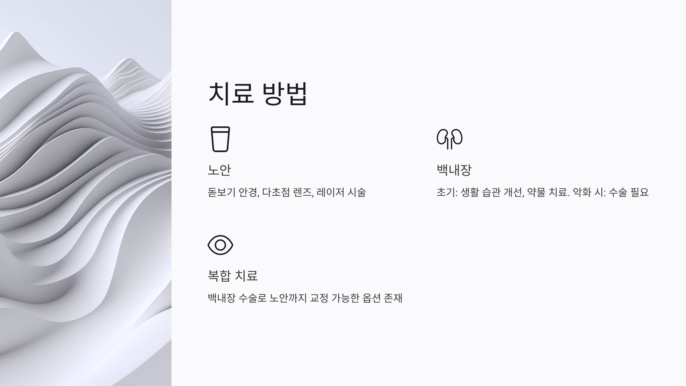 노안의 경우 비침습적인 치료 방법이 주로 사용돼요. 돋보기 안경이나 다초점 렌즈를 착용하면 일상생활에 큰 지장을 주지 않아요. 최근에는 노안 교정용 레이저 시술도 많이 사용되고 있답니다. 이러한 시술은 수정체를 조정해 초점 조절을 쉽게 만들어주는 역할을 해요.