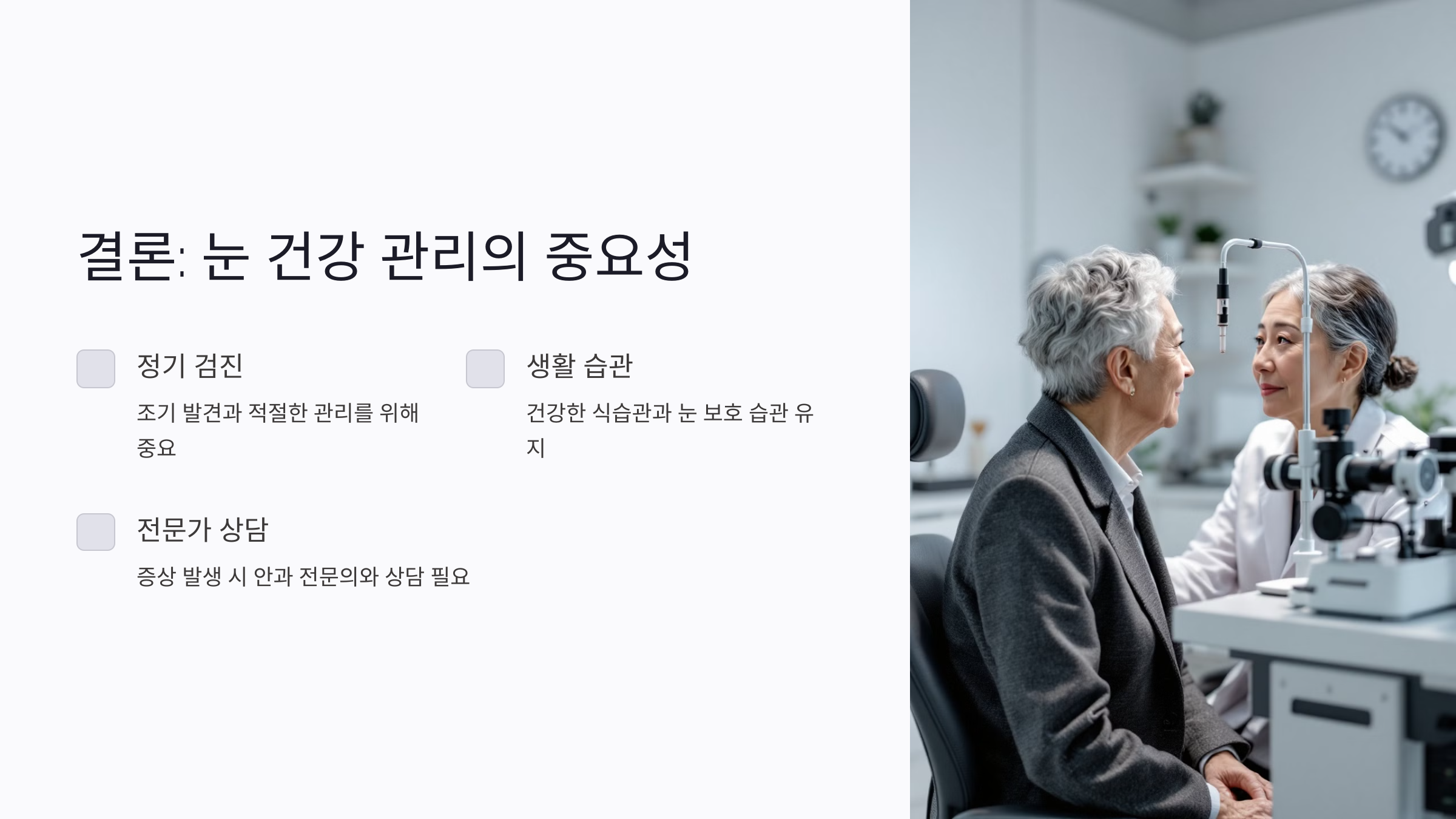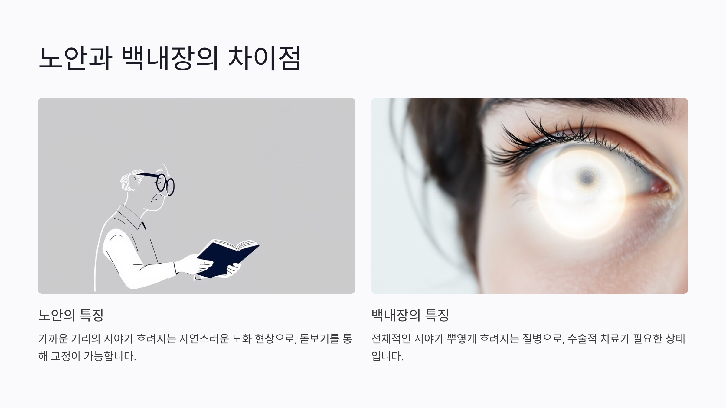 또한 노안은 자연스러운 노화의 일부이지만, 백내장은 질병으로 분류돼요. 백내장의 경우 치료 시기를 놓치면 심각한 시력 저하를 초래할 수 있어요. 따라서 두 질환을 정확히 구분하고 필요 시 전문적인 진단을 받는 것이 중요해요.