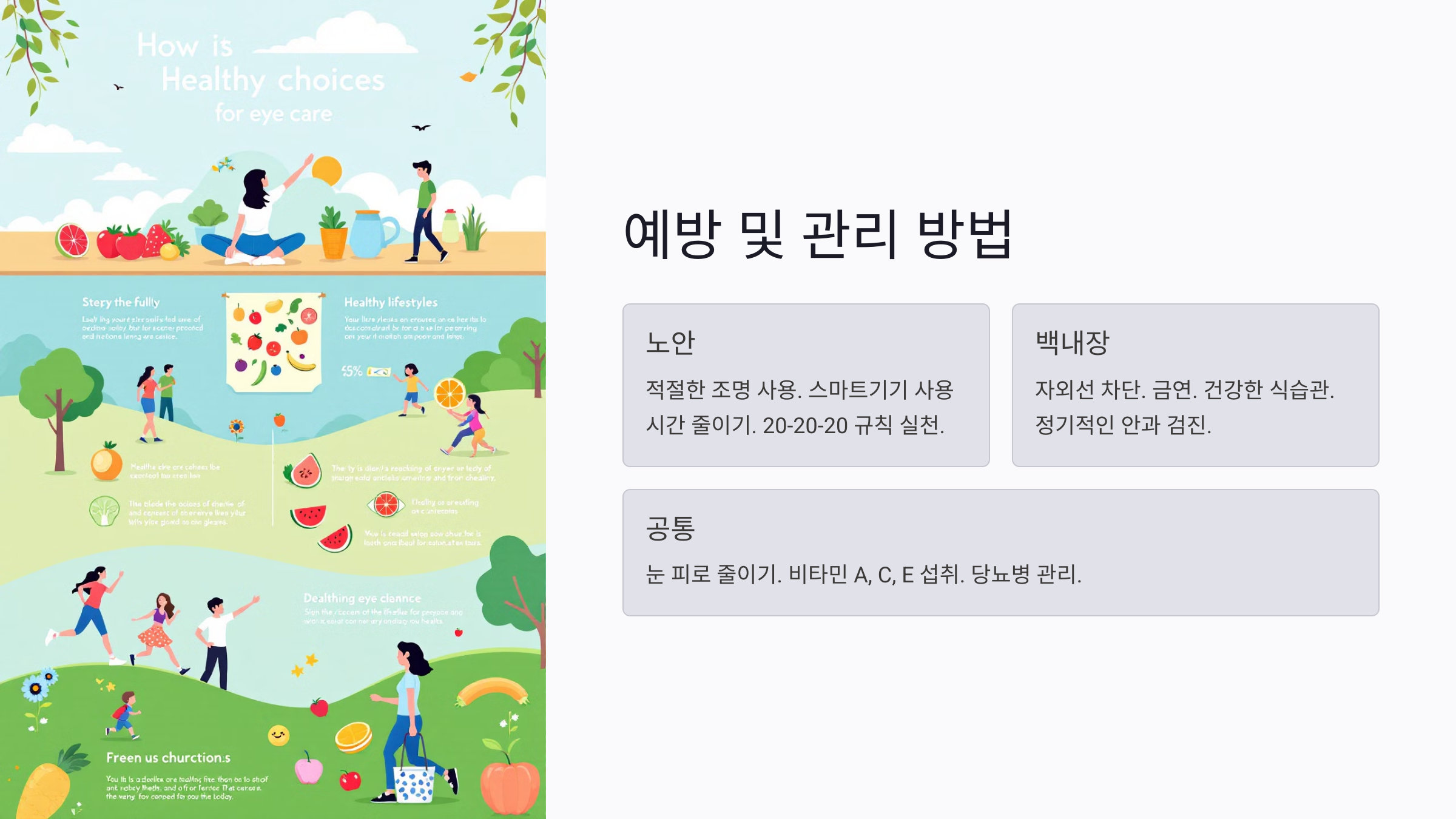 눈 건강을 지키기 위해 평소에 눈의 피로를 줄이고, 균형 잡힌 식사를 통해 비타민 A, C, E가 풍부한 음식을 섭취하는 것도 효과적이에요. 당뇨병이 있는 경우 혈당 관리를 철저히 하는 것이 백내장을 예방하는 데 큰 도움이 돼요.
