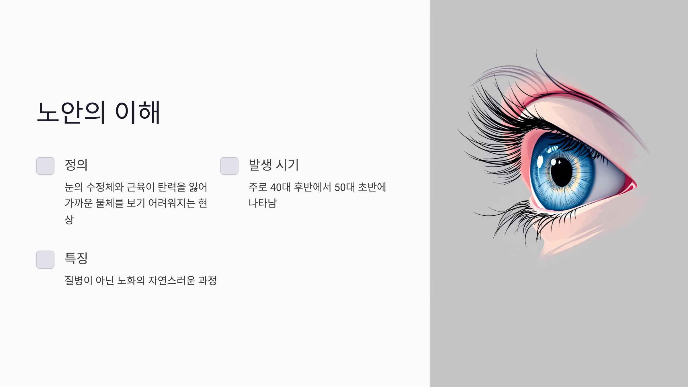 노안은 나이가 들면서 눈의 수정체와 근육이 탄력을 잃어 생기는 자연스러운 현상이에요. 쉽게 말해, 눈이 초점을 맞추는 능력이 떨어지면서 가까운 글씨나 물체를 보기 어려워지는 상태를 말해요. 보통 40대 후반에서 50대 초반에 주로 나타나며, 스마트폰 글씨를 점점 멀리해야 읽을 수 있는 증상이 나타나는 경우가 많아요.