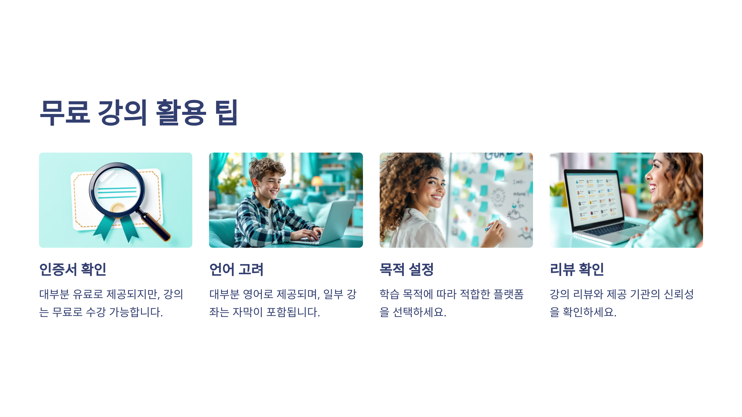 A: 강의 리뷰와 제공 기관의 신뢰성을 확인하세요.