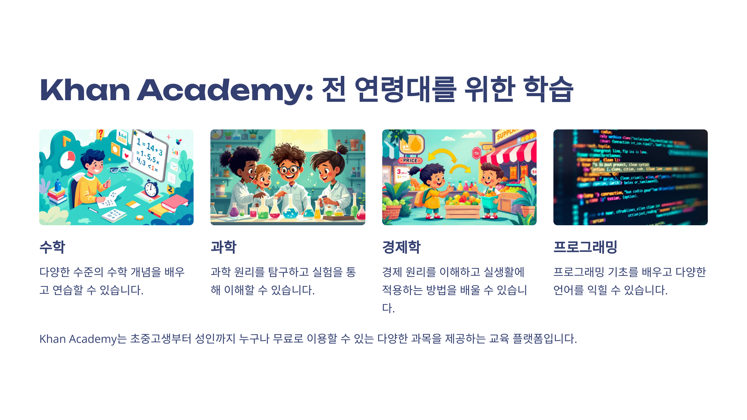 Khan Academy는 전 세계적으로 이용 가능한 무료 학습 플랫폼입니다.