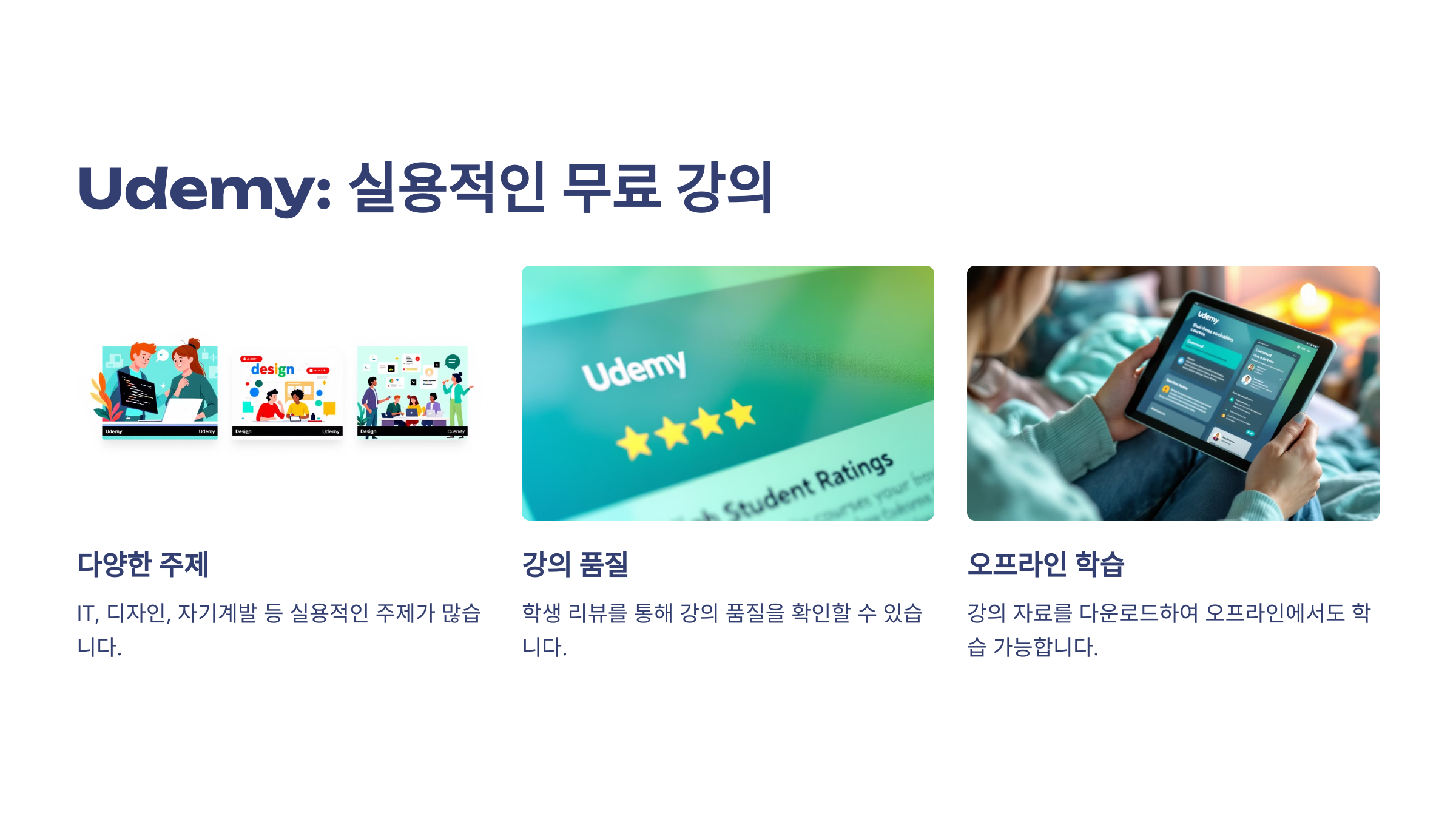 Udemy는 다양한 주제의 강의를 제공하며 일부 무료 강의도 포함되어 있습니다.