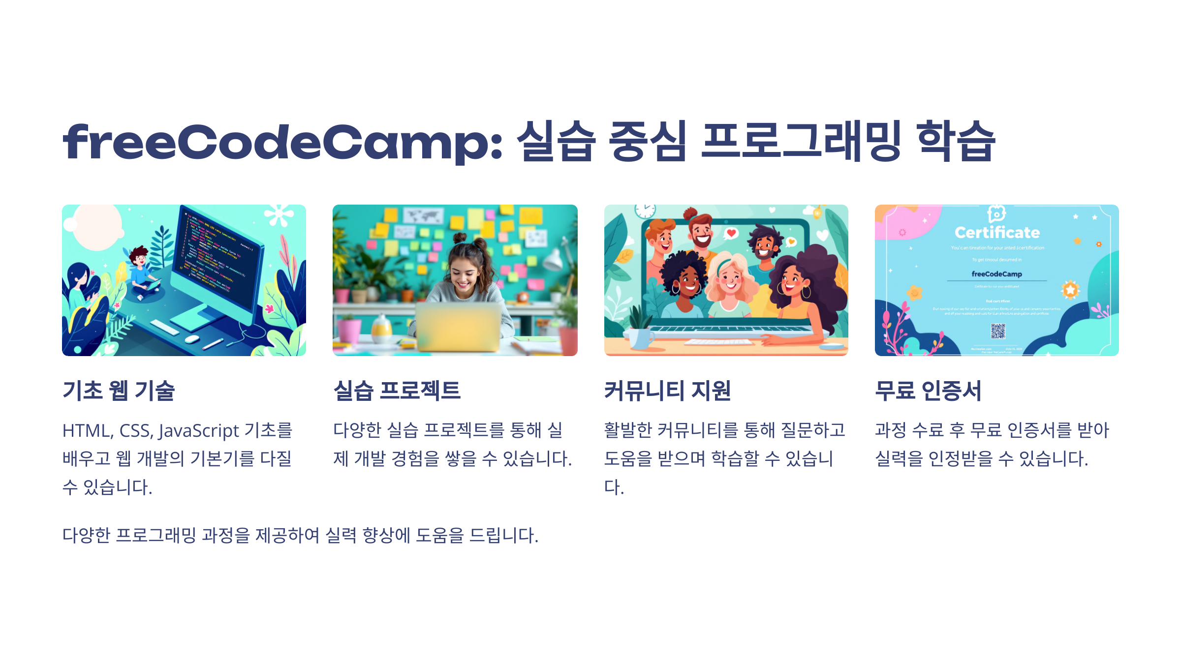 freeCodeCamp는 프로그래밍과 웹 개발을 배우기에 최적화된 플랫폼입니다.