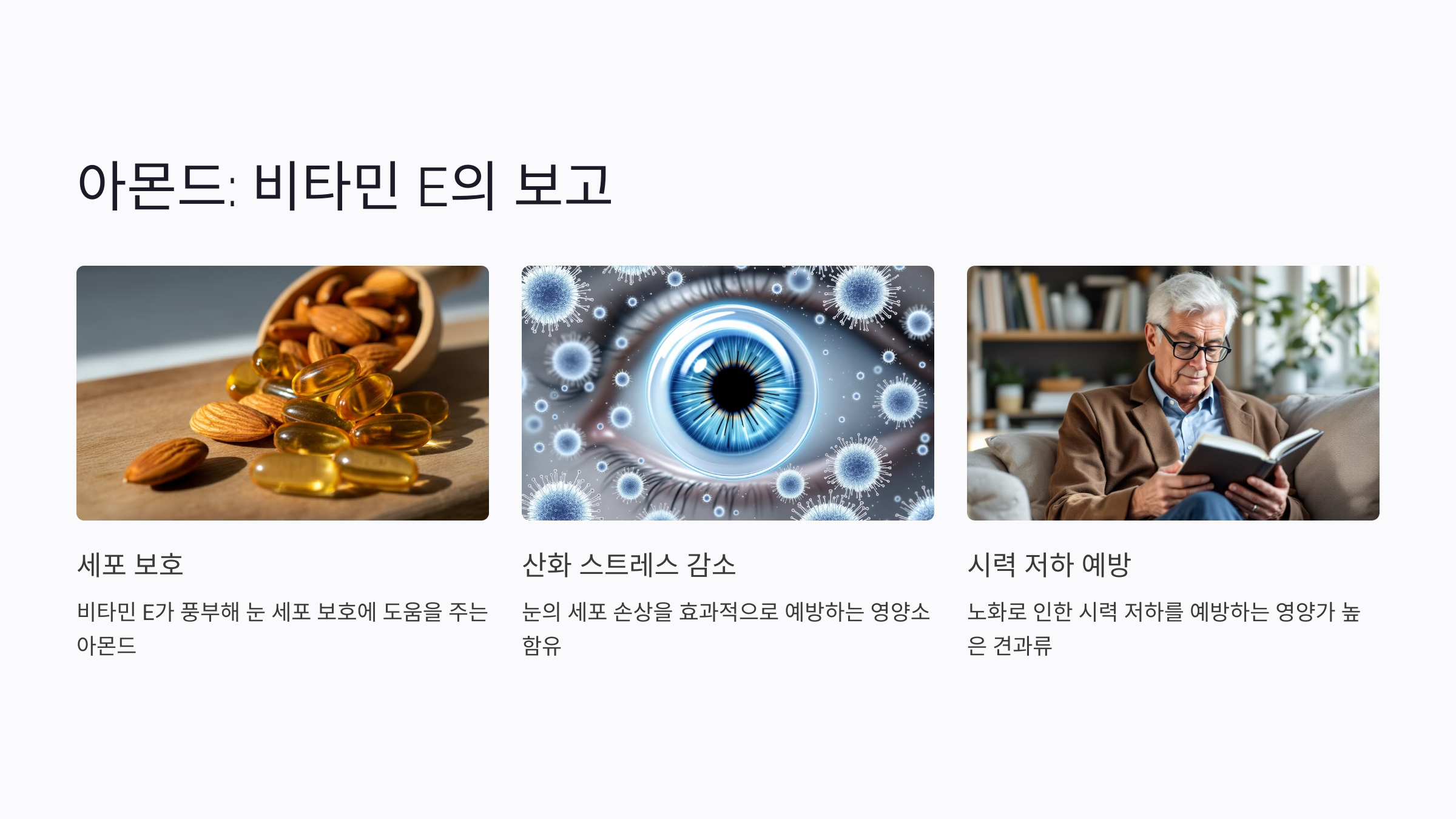 아몬드는 비타민 E가 풍부해 눈을 포함한 신체의 세포를 보호해주는 데 효과적이에요. 비타민 E는 산화 스트레스를 줄여주고, 눈의 세포 손상을 예방하는 데 중요한 역할을 해요. 꾸준히 섭취하면 노화로 인한 시력 저하를 예방할 수 있어요.