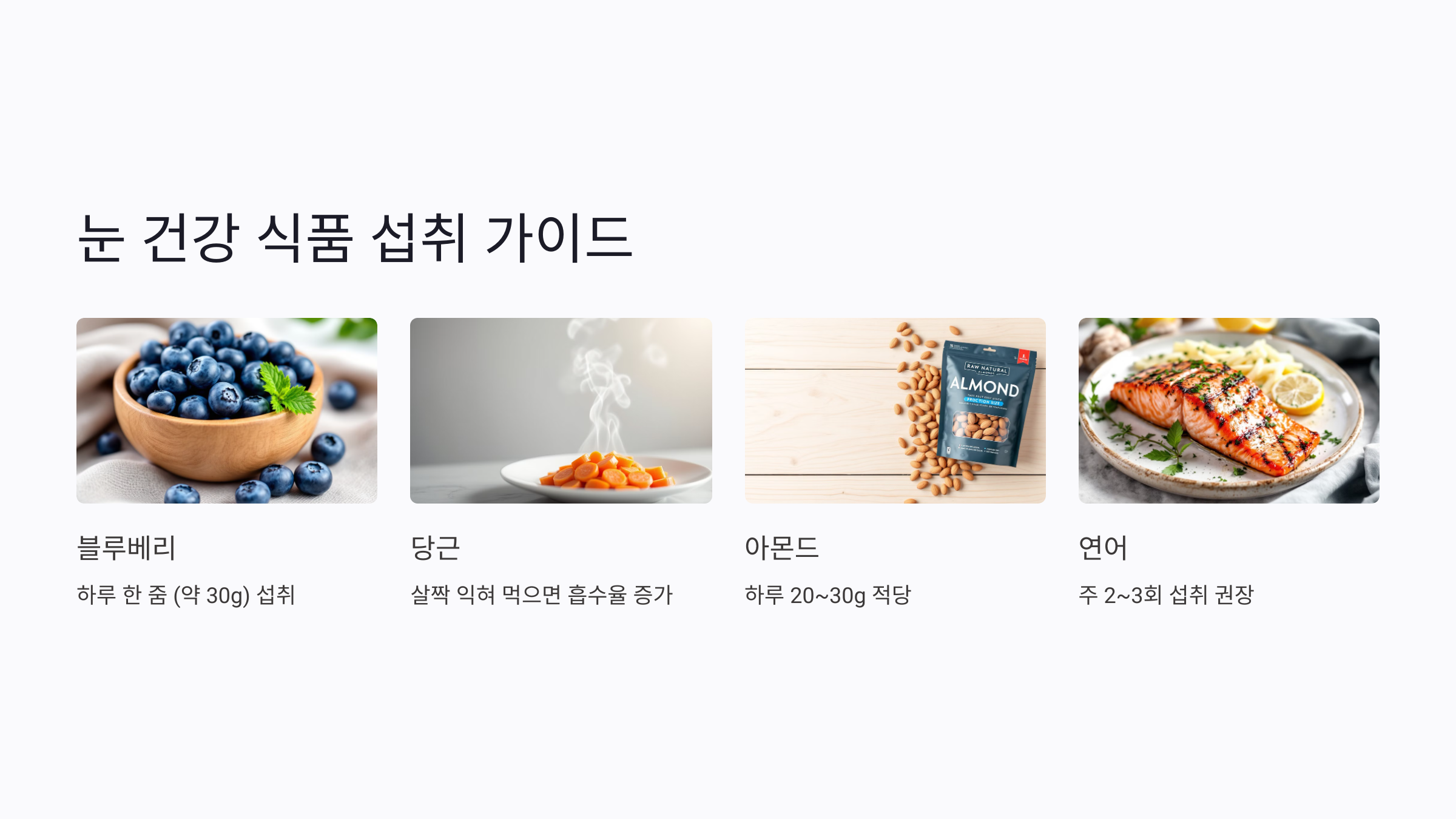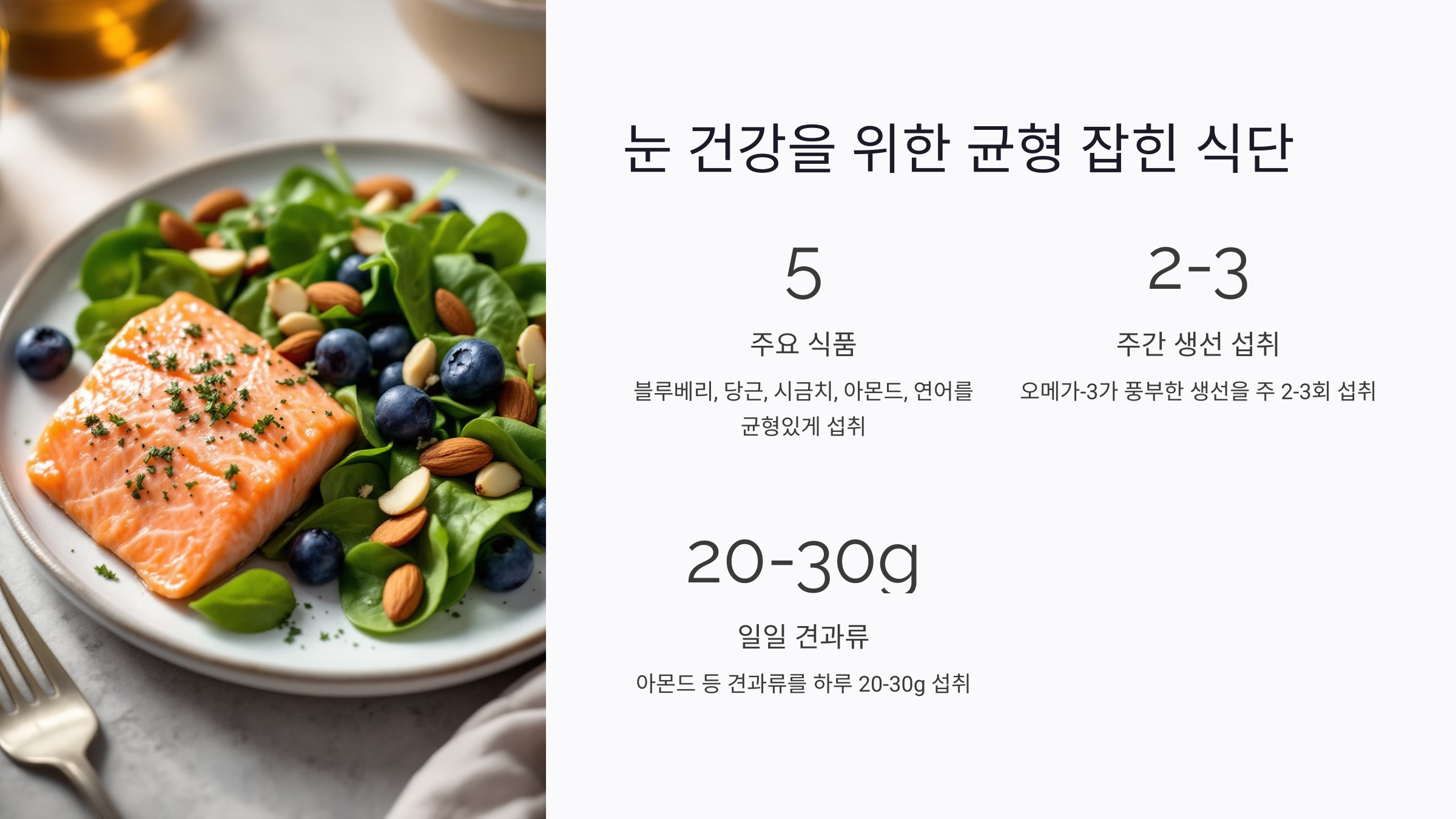 특히 아몬드는 간편하게 섭취할 수 있는 건강 간식으로, 하루에 약 한 줌(약 20~30g) 정도가 적당해요. 단, 칼로리가 높은 편이니 적당량만 섭취하는 것이 좋아요. 생아몬드뿐 아니라 견과류 믹스나 아몬드 버터도 눈 건강에 도움이 돼요.