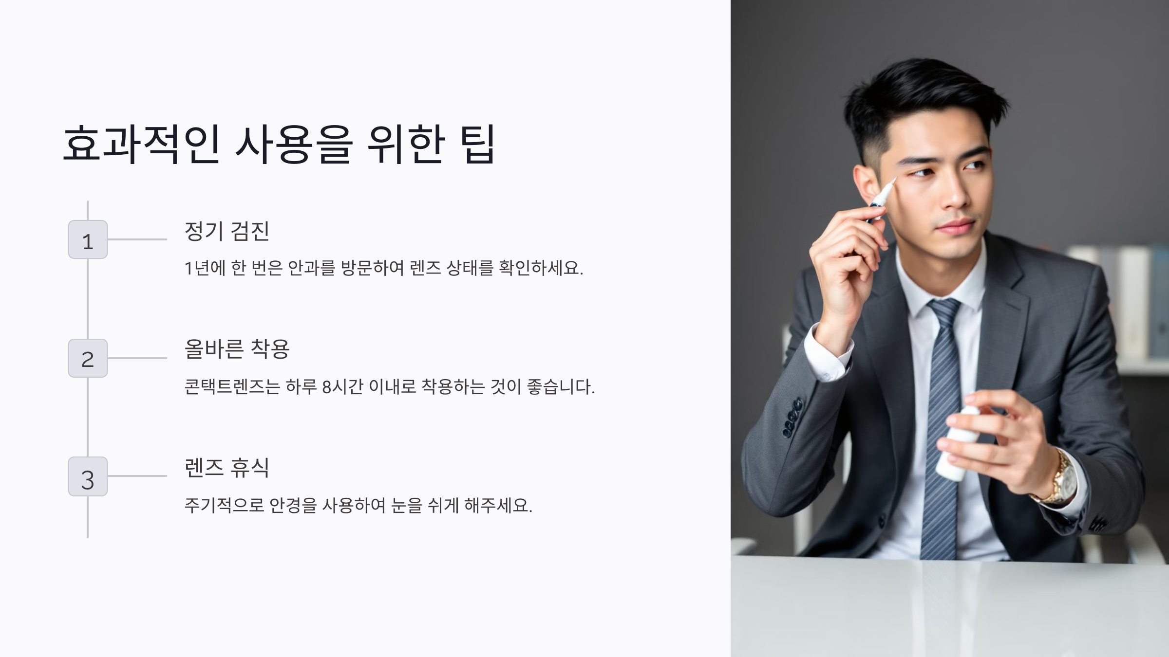 렌즈를 효과적으로 사용하려면 몇 가지 팁을 기억하세요. 올바르게 착용하고 관리하면 노안 교정 효과를 극대화할 수 있어요.