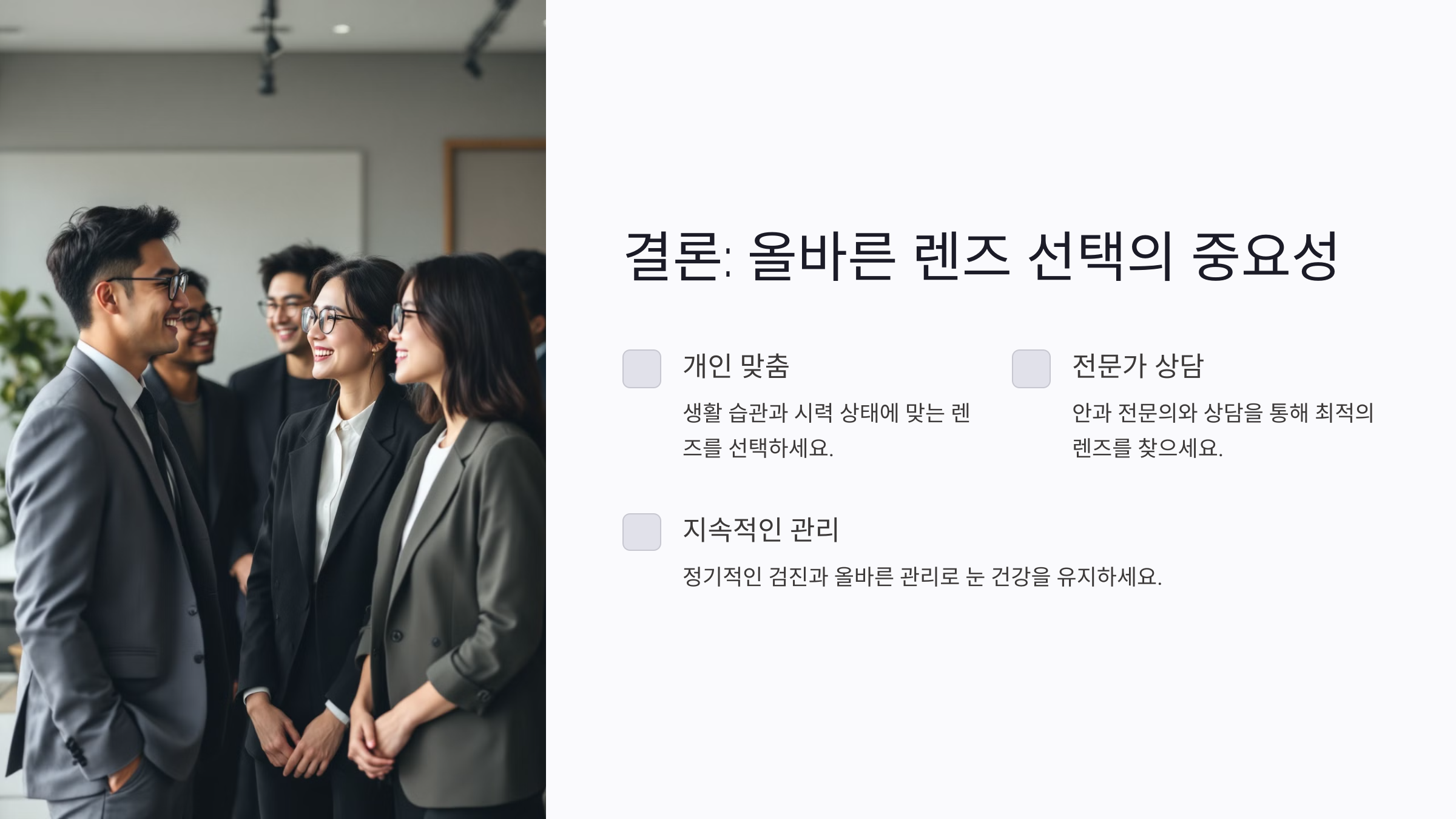2. 시력 상태: 본인의 시력이 좌우 눈 각각 다른 경우라면, 전문가의 상담을 통해 적합한 렌즈를 추천받는 것이 중요해요. 특히 다초점 렌즈는 개인의 시력 상태에 따라 맞춤 제작이 필요할 수 있어요.