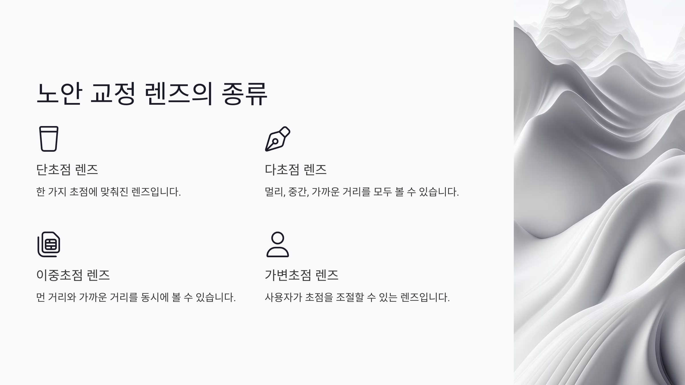 노안 교정 렌즈는 여러 종류가 있어요. 각 렌즈마다 특징과 용도가 다르기 때문에 본인의 생활 습관과 필요에 맞게 선택하는 것이 중요해요. 대표적인 렌즈 종류를 소개할게요: