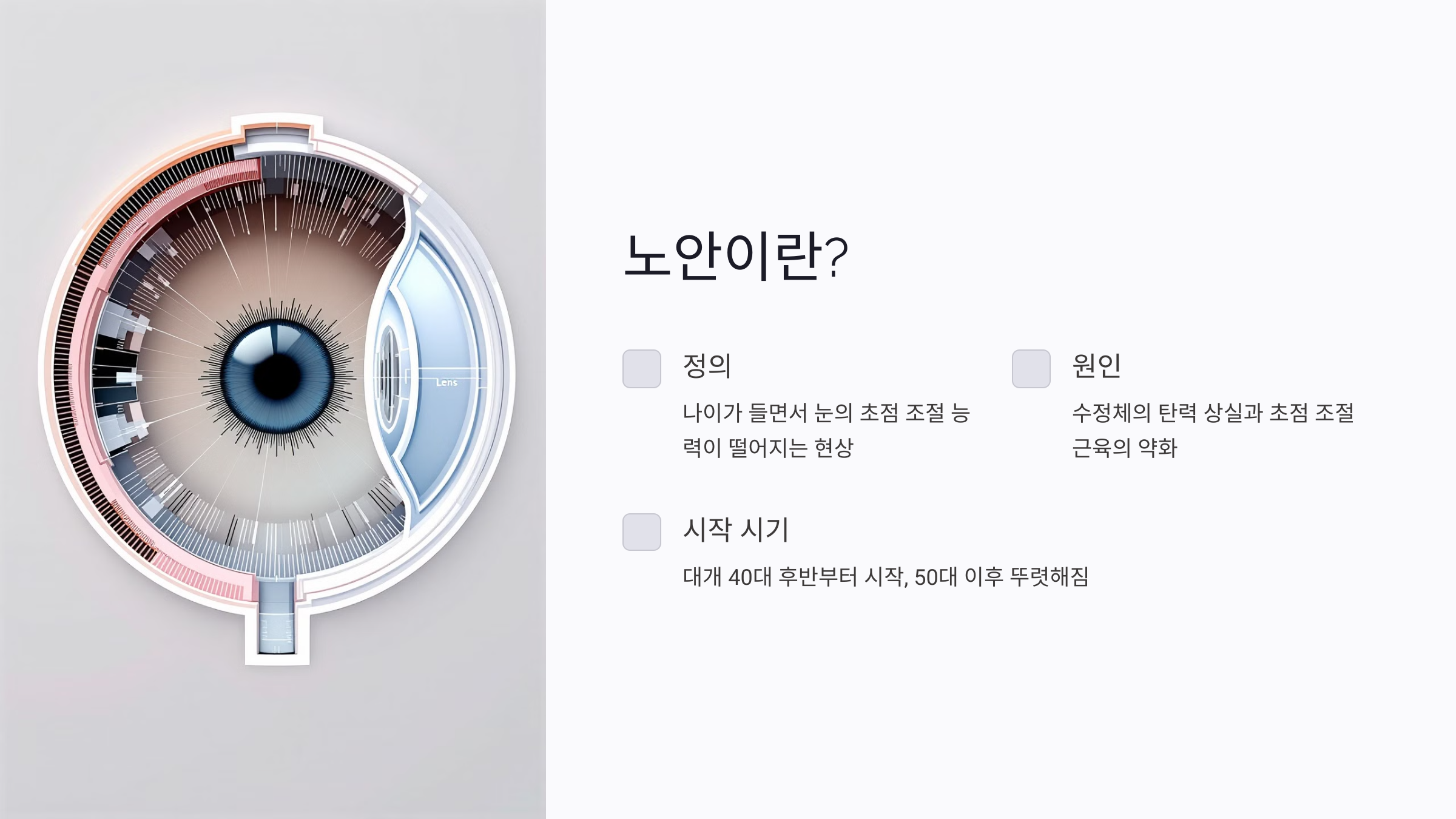 노안은 나이가 들면서 눈의 초점 조절 능력이 떨어져 가까운 물체를 보기 어려워지는 자연스러운 노화 현상이에요. 우리 눈의 수정체는 탄력을 잃고, 초점을 맞추는 근육이 약해지기 때문에 발생하죠. 대개 40대 후반부터 증상이 시작되며, 50대 이후에는 더 뚜렷해지는 경우가 많아요.