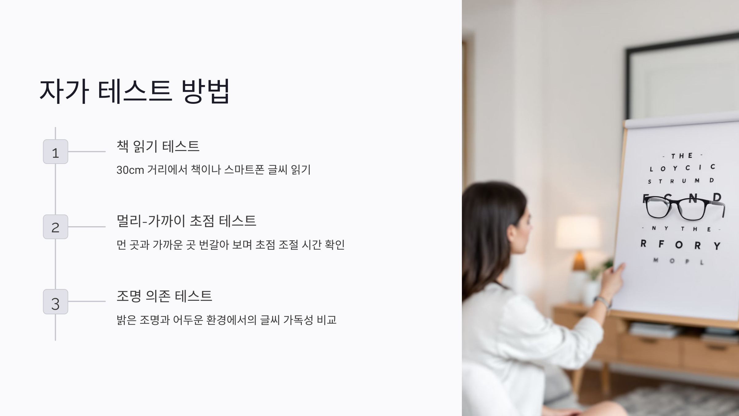 병원에 가기 전에 간단한 테스트로 노안을 확인해볼 수 있어요. 아래 방법을 따라해 보세요: