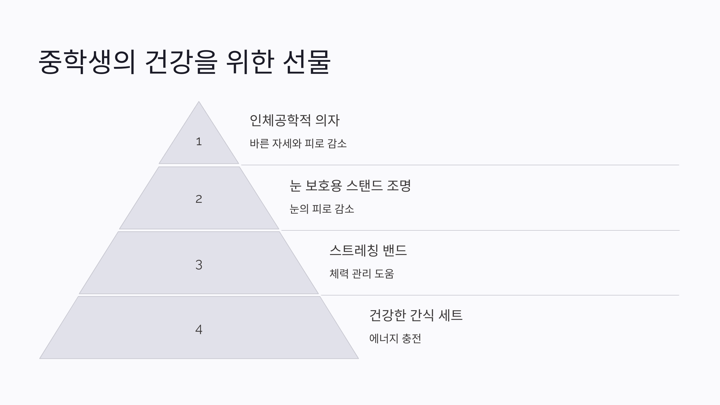 A4. 인체공학적 의자, 눈 보호 스탠드, 스트레칭 밴드, 건강 간식 세트가 중학생에게 적합한 건강 관련 선물이에요.