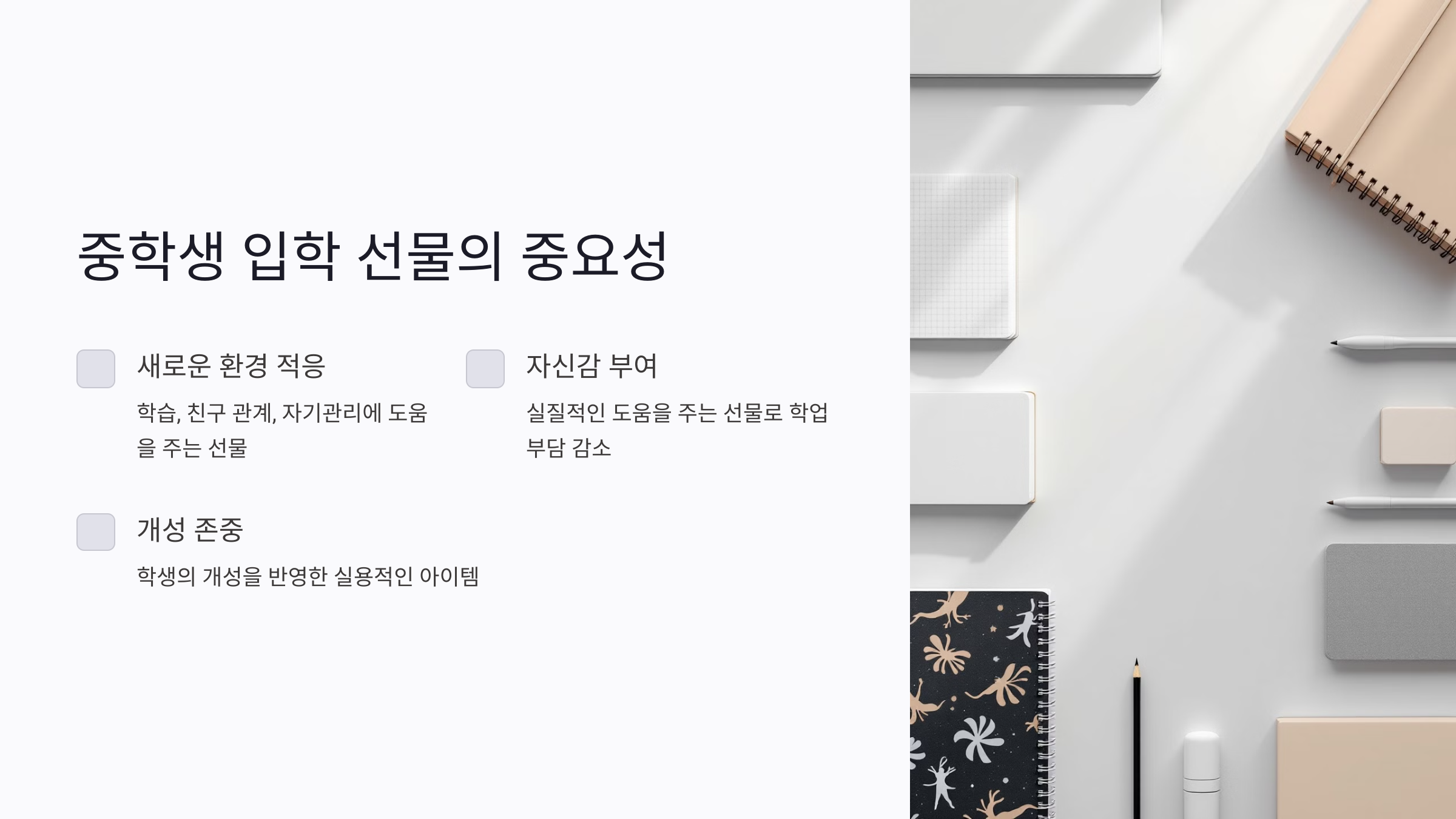 중학교 입학은 아이들이 학습, 친구 관계, 자기관리에 있어 더 높은 수준의 책임감을 요구받는 시기예요. 이 시기에 선물은 중학생이 새로운 환경에 잘 적응하고 자신감을 가질 수 있도록 도와주는 중요한 역할을 해요. 단순히 축하의 의미를 넘어, 실질적인 도움을 줄 수 있는 선물을 고르는 것이 중요해요.