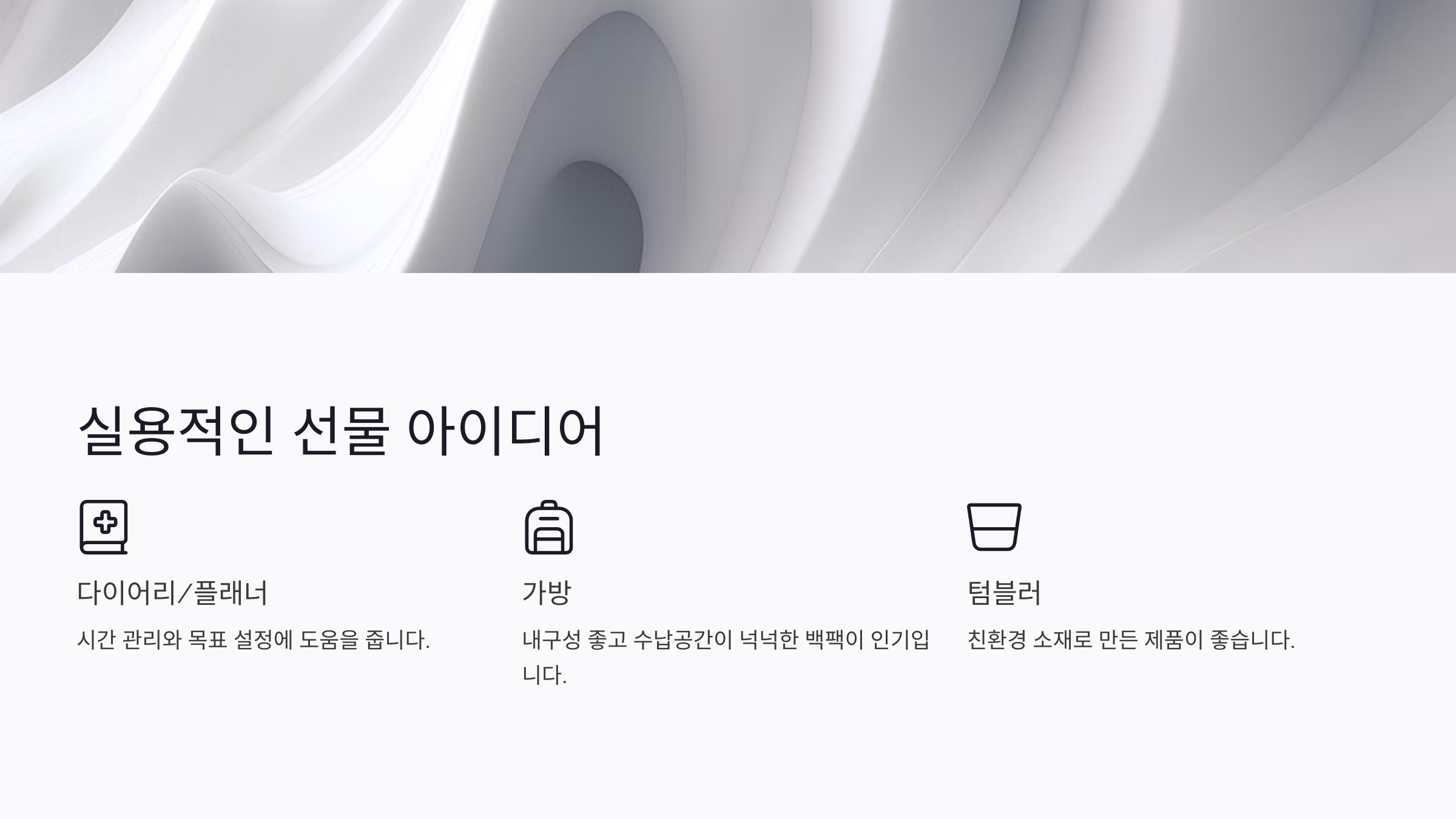 A1. 다이어리, 플래너, 노트북, 무선 이어폰, 텀블러 등이 실용적이면서도 인기가 많은 선물이에요.